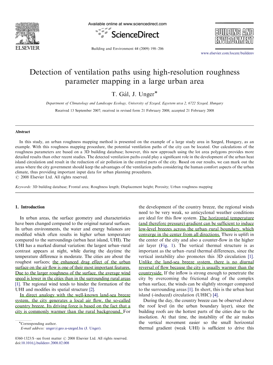 在这个研究中,以城市粗糙度测绘方法为例(主要写匈牙利塞格德),通过这种粗糙度测绘程序,可以找到城市的潜在通风路径。 我们对粗糙度参数的计算基于3D建筑数据库; 然而,使用地面多边形的这种新方法提供了比其他近期研究更详细的结果。 检测到的通风路径可以在城市热岛循环发展中发挥重要作用,使城市中部地区空气污染减少。 根据我们的结果,我们可以看出,城市政府应考虑到城市气候的人类舒适度,保持通风路径的优势,为城市规划提供重要的投入。