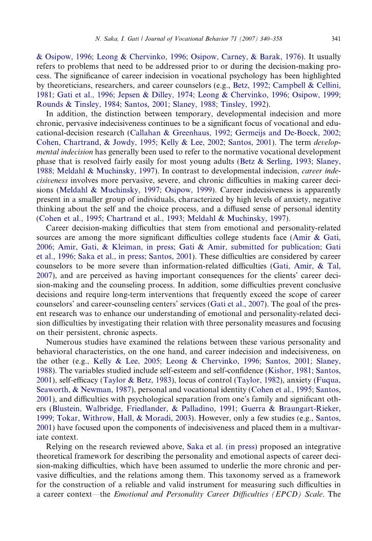 本研究的主要目的是检验Saka等人提出的理论模型的有效性。有两种方式。首先,我们通过证明EPCD测量的困难的持续方面来检验该模型的有效性。第二,我们研究了EPCD (代表所提出的模型)与一般优柔寡断、自尊、焦虑和认同状态的测量之间的相关性。选择这些措施作为理论上相关的相关因素,期望它们支持所提出的模型的构造有效性。除了对优柔寡断的一般测量之外,在本研究中,我们还重点研究了三个假设与自我概念和认同群中的类别相关的测量。今后的研究应侧重于调查这些措施如何与其他两大类相关联。在一项研究中对所有三个主要群组分别采用若干措施加以验证是不可行的。对于所使用的测量,我们在下面解释了EPCD量表和所使用的有效性测量之间的理论关系。自尊。职业选择通常被视为个人自我概念在职业术语中的表达( Super,1953 )。自尊在实现一个人的自我概念中起着核心作用(沙特兰,罗宾斯,莫里尔和博格斯,1990年),因为人们倾向于选择能让他们实现感知潜力和增强自我价值感的职业。此外,许多研究发现自尊与优柔寡断之间存在负相关:自尊越低,优柔寡断越高( Kishor,1981;桑托斯,2001年;伍尔夫和斯泰茨,1999年)。因此,我们期望这三个群体与EPCD总分和自尊之间存在负相关。我们还假设自我概念和认同的主要集群与自尊的相关性最高。特质焦虑。一般特质焦虑与职业选择承诺呈负相关,而焦虑与职业优柔寡断呈正相关( Hartman,Fuqua amp; Blum,1985;梁和切尔文科,1996年;迈耶与怀纳,1993;万伯格和穆钦斯基,1992 )。Santos ( 2001 )发现特质焦虑与一般优柔寡断呈高度正相关,特质焦虑与职业认同呈负相关。因此,我们期望EPCD总分和三个聚类得分之间存在正相关,一方面和特质焦虑之间存在正相关。再次,我们假设自我概念和认同的主要集群与特质焦虑的相关性最高。身份地位。一般自我和身份相关变量,如个人和职业身份变量( Blustein,Devenis和runder,1989 ),被发现与职业优柔寡断相关。研究身份地位与职业选择困难之间关系的一种方法是Marcia ( 1980年)提出的范式,他根据个人在生活中如何作出重大决定以及对这些决定的承诺程度,将个人分为四种身份地位之一: ( a )获得身份;( b )取消身份赎回权;( c )暂停身份;( d )分散身份。研究发现,暂停和扩散认同都与职业优柔寡断相关(例如Blustein等人)。1991年;布里斯宾和萨维奇卡,1994年)。因此,我们期望总344个Saka、I . Gati /职业行为杂志71 ( 2007 ) 340–358个EPCD总分和三个聚类得分与暂停措施和扩散身份状态之间存在正相关。我们还假设自我概念和认同的主要集群与认同状态测量的相关性最高。一般优柔寡断。一般优柔寡断表现为在各种情况下难以作出决定( Frost amp; Shows,1993;加蒂等人。1996年;( 1969年)。将优柔寡断的人描述为“似乎难以做出各种人生决定的人,无论这些决定意义重大还是微不足道”(第305 - 306页)。此外,先前的研究已经建立了优柔寡断与个性特征之间的联系。salomone ( 1982 )发现,优柔寡断的人通常具有低自信、低自尊、身份不明、无助、高度矛盾和沮丧以及外部控制中心等个性特征。最近的研究支持了优柔寡断与职业决策任务之间的联系(如Gati等)。1996年;germaijs和De - Boeck,2002年)。我们假设EPCD总分与三大类得分之间存在中度正相关关系,一方面是总体优柔寡断的衡量标准。