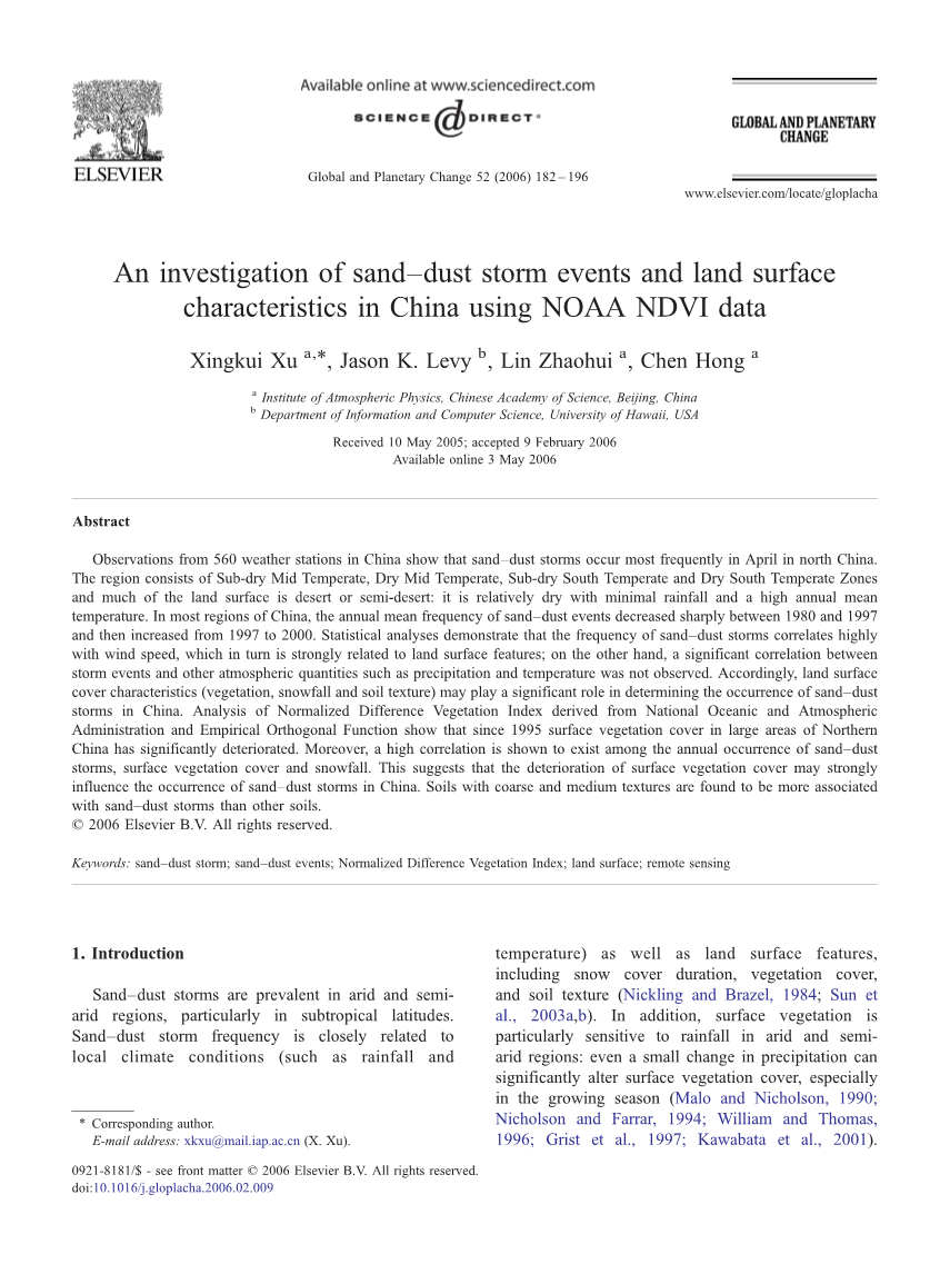 中国560个气象站的观测表明,4月份华北地区沙尘暴最为频繁。该区为中干温带、中干温带、亚干南温带和干温带温带沙地,大部分地表为沙漠或半荒漠,相对干旱,降水量少,年平均气温高。在中国大部分地区,沙尘事件的年平均频率在1980年至1997年间急剧下降然后从1997年增加到2000年。统计分析表明沙尘暴频率与风速高度相关,风速与地面特征密切相关;另一方面,风暴事件与其他大气量如降水和气温之间没有显著的相关性。因此,地表覆盖特征(植被,降雪和土壤质地)可能在确定中国沙尘暴的发生方面起着重要作用。国家海洋和大气管理局归一化差异植被指数和经验正交函数分析表明,1995年以来,中国北方大面积地表植被覆盖度显着恶化。 另外,年沙尘暴,地表植被和降雪量之间存在较高的相关性。由此可见,地表植被盖度的恶化可能会对我国沙尘暴的发生产生强烈的影响。沙尘暴粗,中等质量土壤与沙尘暴相关性较大。