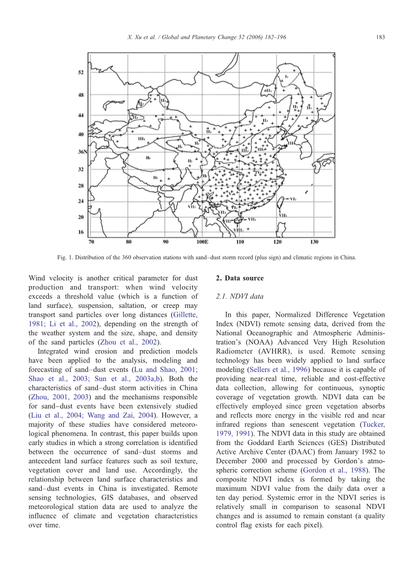综合风蚀和预报模型已经应用于沙尘事件的分析,建模和预测(Lu and Shao,2001; Shao et al。,2003; Sun et al。,2003a,b)。中国沙尘暴活动的特点(Zhou,2001,2003)和造成沙尘事件的机制已经得到了广泛的研究(Liu et al。,2004; Wang and Zai,2004)。但是,这些研究大部分都考虑过气象现象。 相反,本文在早期研究的基础上,确定了沙尘暴的发生与土壤质地,植被覆盖和土地利用等先期地表特征之间的强相关性。因此,调查了中国陆地表面特征与沙尘事件的关系。 利用遥感技术,地理信息系统数据库和观测气象站数据分析气候和植被特征随时间的变化。