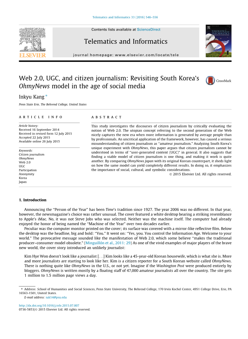 本文从批判性角度评估Web 2.0的概念,探讨公民新闻的话语权。乌托邦的概念,指的是第二代互联网时代普通人与专业人士相比而言发布和获取了更多的信息,很好地抓住了新时代趋势。但是这个本应该是一个不带任何批判性的应用程序,但是现阶段,公民新闻已经被严重地误解为“业余的新闻”。本文透过分析韩国OhmyNews提出公民新闻不能理解为“用户生成的内容(UGC)”的总称。这也表明,发现公民新闻的一个可行的模式是一回事,并利用这个机会完全是另一回事。通过OhmyNews日本版与韩国本土原版相比,来揭示出同样的模式如何能够产生完全不同的结果。本文想以此来强调社会,文化,以及它们背后的重要意义。