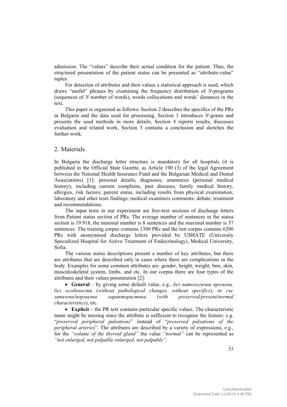 这使得自动提取成对“属性值”的任务变得相当艰巨。解剖器官没有本体论的复杂。状态描述在拉丁语中包含许多术语,这进一步阻碍了问题的解决。PRS包含保加利亚语和拉丁语的混合术语。用西里尔字母誊写拉丁医学术语。还有很多拉丁语和保加利亚语中的缩略语。进一步的具体问题是由于保加利亚语的词形变化;术语出现在文本中,有多种词。这是典型的保加利亚语的典型形式。其他的障碍是缺乏可用的电子格式资源。因此,任务以结构化格式提取当前患者状态数据是相当的具有挑战性的。PRS在保加利亚的唯一优点是文本呈现使用标准部分的结构化格式。这允许将PRS分成部分高精度和识别病人的状态描述。