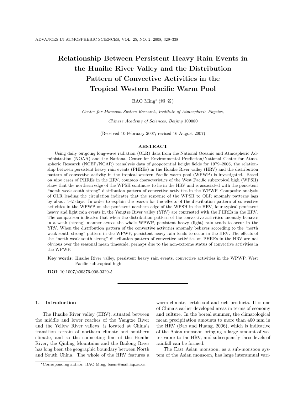 关键词:淮河流域,持续暴雨,WPWP对流活动,西太平洋副热带高压