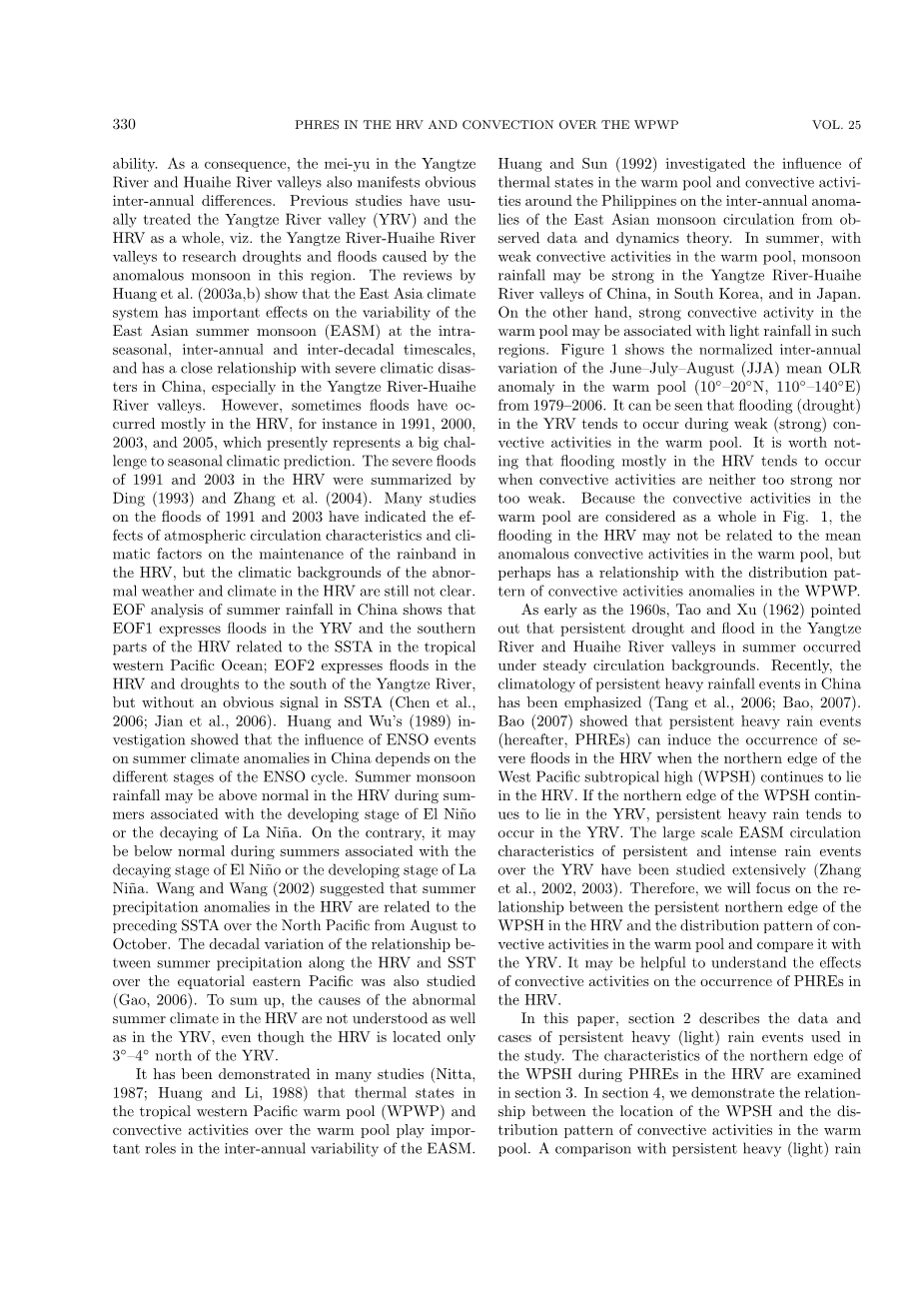 和Li,1988),热带西太平洋暖池(WPWP)中的热状态和暖池中的对流活动在EASM的年际变率中起重要作用。Huang和Sun(1992)通过观测数据和动力学理论,研究了菲律宾周围暖池和对流活动的热状态对东亚季风环流年际异常的影响。在夏季,暖池中对流活动弱,季风降水在中国长江 - 淮河流域,韩国和日本可能较强。另一方面,暖池中的强对流活动可能与这些区域相关。图1显示了1979 - 2006年暖池(10◦-20◦N,110◦-140◦E)6月– 7月 - 8月(JJA)平均OLR异常的归一化年际变化。 YRV中的洪涝(干旱)倾向于在暖池中的弱(强)对流活动期间发生。值得注意的是,大多数发生在HRV中的洪涝趋向出现在对流活动既不太强烈也不太弱时。因为暖池中的对流活动在图1中被认为是一个整体,如图1所示,HRV中的洪水可能与暖池中的异常对流活动无关,但可能与WPWP中对流活动异常的分布格局有关。