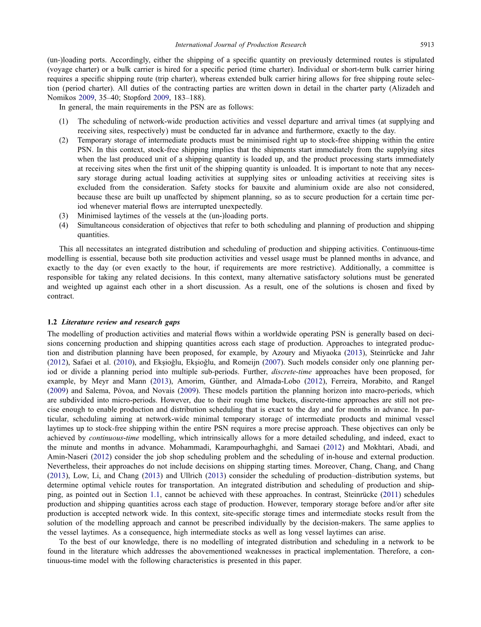 在全球范围内,生产活动和物资流动的模型通常是根据生产和运输的数量决定的。方法提出了综合生产和销售计划,例如,通过Azoury和Miyaoka(2013),Steinrucke和Jahr(2012),Safaei et al。(2010),和Ekşioğlu ,Ekşioğlu,Romeijn(2007)。这些模型只考虑一个规划周期或将规划周期划分为多个子周期。此外,还提出了一些谨慎的时间方法,例如Meyr和Mann(2013)、Amorim、Gunther和Almada-Lobo(2012)、Ferreira、Morabito和Rangel(2009)和Salema、Povoa和Novais(2009)。这些模型将规划范围划分为宏观时期,并将其细分为微观时期。然而,由于它们的时间比较粗糙,离散时间的方法仍然不够精确,使得生产和分发调度能够精确到日期和提前几个月。特别地,在整个PSN中,针对网络范围最小的中间产品临时存储和最小的船舶闲置时间的调度,需要采用更精确的方法。这些目标只能通过持续时间建模来实现,而这本质上允许更详细的调度,而且确实精确到一分钟和几个月。Mohammadi、karampourhaghi和Samaei(2012)、Mokhtari、Abadi和Amin-Naseri(2012)考虑了车间调度问题以及内部和外部生产的调度问题。然而,他们的方法不包括航运起始时间的决定。此外,Chang, Chang, Chang (2013), Low, Li, Chang(2013)和Ullrich(2013)考虑了生产分配系统的调度,但确定了最优的交通运输路线。正如第1.1节所指出的,生产和运输的一体化分配和调度不能通过这些方法实现。相比之下,Steinrucke(2011)将生产和运输的数量安排在生产的各个阶段。然而,在站点生产之前和/或之后的临时存储被广泛接受。在这种情况下,特定于站点的存储时间和中间股票是由建模方法的解决方案产生的,而不能由决策者单独规定。这同样适用于船舶的装卸时间。因此,高的中间股票和长时间的船舶装卸可能会出现。