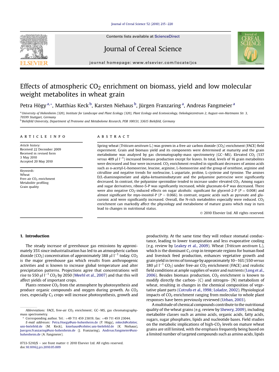 虽然对单个化合物的研究是必要的,但它们可能无法揭示广泛的代谢反应以及它们之间的相互关系受到二氧化碳浓度上升的影响。一些研究已经证明了代谢组谱分析是对植物进行表型分析和诊断分析的有用工具。由于代谢组是基因组的最后一个下行产物,它可能被认为是最接近小麦颗粒的功能或表现型,因此在二氧化碳浓度下,谷物质量是最接近的。因此,使用代谢组技术可以为未来提高质量性状提出建议,因为它们可以用来识别适合植物育种的质量生物标志物。对于小麦,目前只有一项实验是关于二氧化碳引起的对代谢物的影响的。作者说,在室内的实验中,幼苗的叶片代谢组被升高的二氧化碳(大于等于1500mu;l·l-1)改变了,主要原因是C化合物的增加而不是N富代谢物的减少。后一种发现是意料之外的,因为先前实验的结果显示,在二氧化碳富集下,营养植物部分的N成分明显减少。由于代谢物在营养组织衰老和生殖发育的并发过程中经历了进一步的代谢变化和再分配,因此可以假定二氧化碳的升高会影响到发展中谷物中代谢物的可用性,也会影响到谷物的营养状况。因此,对小麦的另一种农事考虑是高二氧化碳对谷物品质性状的影响。利用代谢组学方法进行的分析,可能有助于提供对那些与质量相关的生物标记物的影响的新见解,在二氧化碳富集下,这些生物标记在成熟的小麦颗粒中存在不同的数量,由于在一项研究中观察了大量的代谢物。据我们所知,迄今为止,在实际的二氧化碳浓度和田间条件下,尚未有过对小麦颗粒进行代谢分析的。