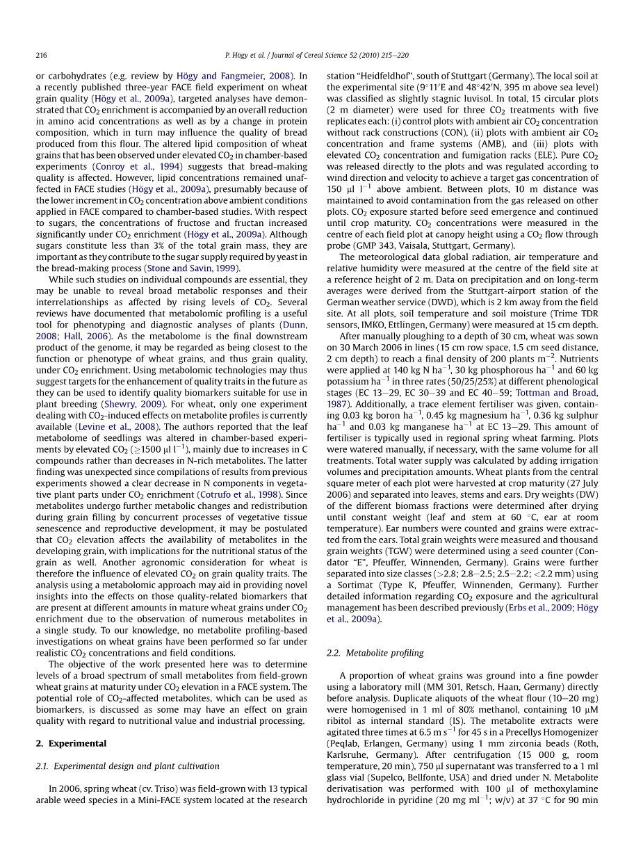 气象数据的全球辐射、气温和相对湿度是在该场址中心以2米的参考高度测量的。关于降水和长期平均值的数据来自于德国气象服务(DWD)斯达格特-机场站,距离现场2公里。在所有的土地上,土壤温度和土壤湿度(Trime TDR传感器,IMKO,Ettlingen,德国)的深度为15厘米。在手工犁地深度30厘米之后,2006年3月30日播种小麦(15厘米的行距,1.5厘米的种子距离,2厘米深),最终密度达到200株每m2。在不同的物候阶段(EC 13-29、EC 30-39和EC 40-59),以不同比率(50/25/25%)每亩分别施用140公斤氮、30公斤磷和60公斤钾盐的营养物质。此外,在EC 13-29中,还施用了微量元素肥料,其中每亩含有0.03公斤的硼、0.45公斤的镁、0.36公斤硫和0.03公斤的锰。这一数量的肥料通常用于地区春小麦种植。如果必要的话,所有的处理用同样的体积来手工浇灌。总水量是通过灌溉量和降水量相加来计算的。中央广场每一个处理的小麦都是在成熟时收获的(2006年7月27日),并将其分离成树叶、茎和穗。不同生物部分的干重(DW)是在干燥直到恒定的重量后确定的(叶子和茎在60度,穗在室温下)。数了穗数,将谷粒从穗上取下。测量了总谷物重量,并使用种子计数器(Condator“E”、 Pfeuffer、温嫩登德国)确定了千粒重(TGW)。谷物被进一步分成大小类((gt;2.8; 2.8-2.5; 2.5-2.2; lt;2.2 mm)使用Sortimat(类型K,p费尔,温登,德国)。关于二氧化碳暴露和农业管理的进一步详细信息已经被描述过(Erbs等人,2009;Hogyet。,2009)。