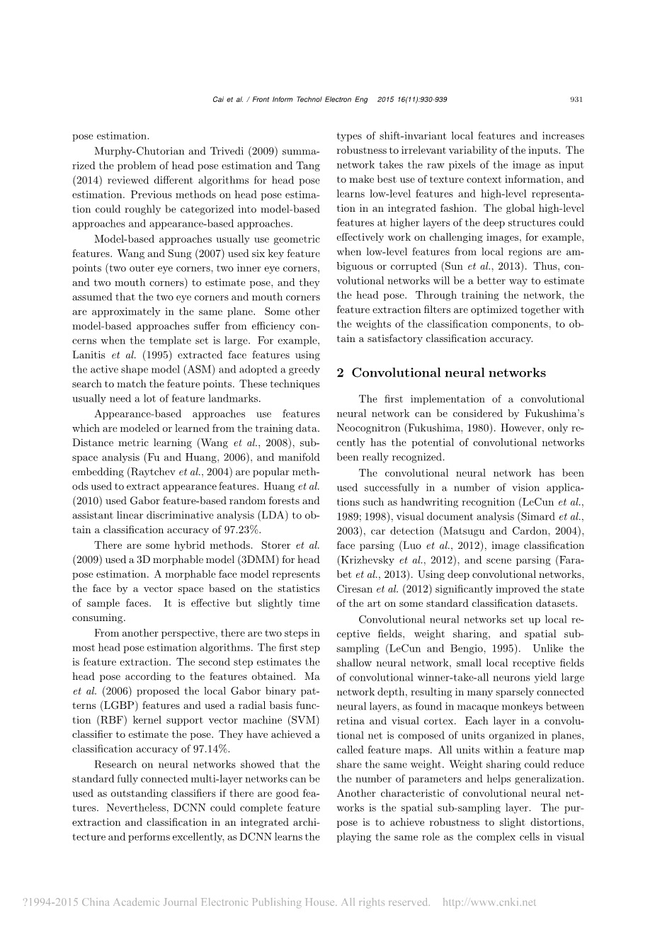 有关神经网络研究表明,如果有很好的功能,标准全连接的多层网络可以作为优秀的分类器。然而,DCNN可以完成功能是在在综合体系结构中提取和分类,并且表现优异,因为DCNN是学习了移位不变局部特征的类型,并增加了输入的无关变异性的鲁棒性。网络将图像的原始像素作为输入可以最好地利用纹理上下文信息,并且以综合方式学习低级特征和高级别表示。深层结构的较高层的全球高层特征可以有效地处理具有挑战性的图像,例如,当本地区域的低层特征不明确或损坏时(Sun等,2013)。此时,卷积网络将是能够更好的估计方法头部姿势。通过培训网络,特征提取滤波器被一起优化分类分量的权重,以获得令人满意的分类精度。