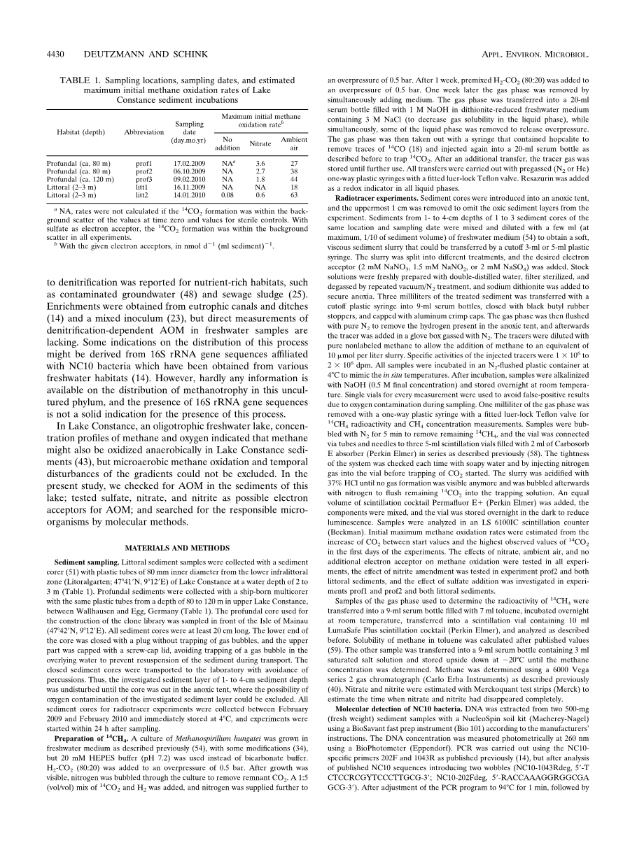 在淡水康斯坦茨湖中,甲烷和氧气的浓度分布表明在该湖沉积物中可能存在甲烷厌氧氧化[43],但不能排除微氧化甲烷氧化和梯度的时间干扰。在本研究中,我们在该湖的沉积物中检查了AOM,测试硫酸盐,硝酸盐和亚硝酸盐作为AOM可能的电子受体,并通过分子方法寻找微生物。