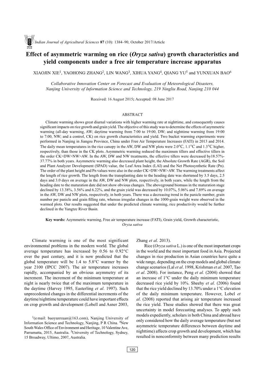 本研究的目的是确定不对称增温对水稻生长和籽粒产量的影响。于中国南京进行了田间试验,以使用自由空气温度升高(FATI)装置来研究不对称升温对淮稻5号水稻品种的生长和产量的影响。