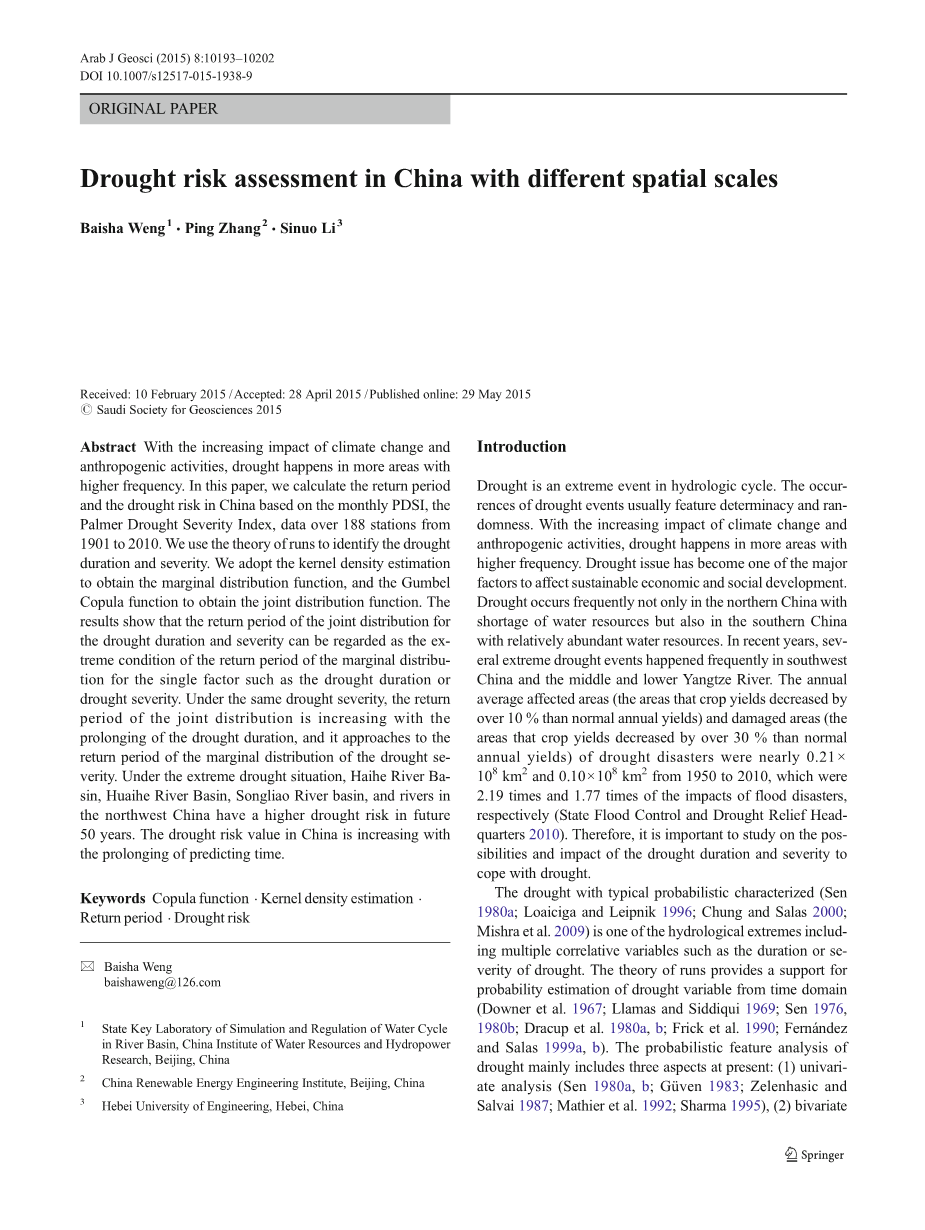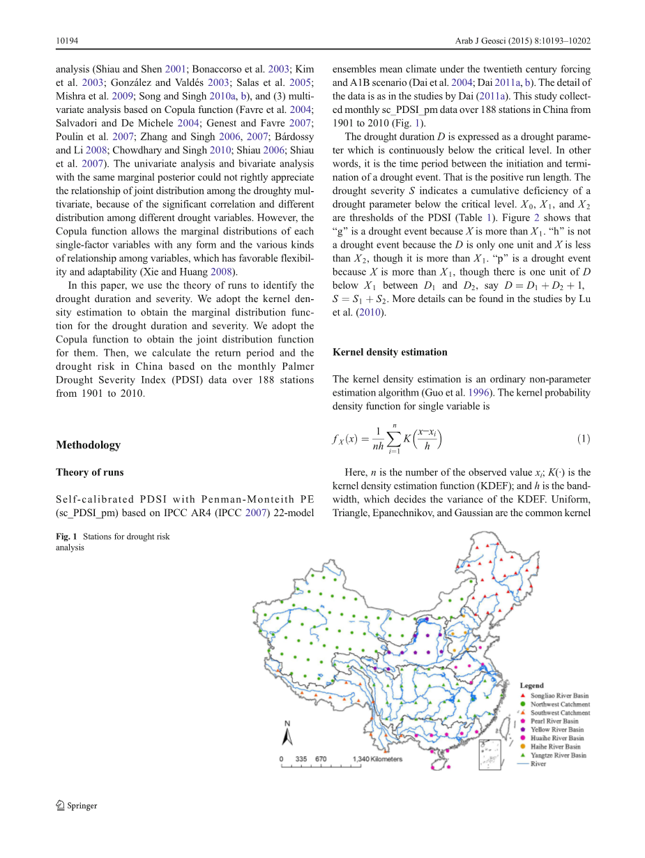 具有典型概率特征的干旱(Sen,1980a;Loaiciga和Leipnik,1996;Chung和Salas,2000;Mishra等人,2009)是水文极端之一,包括多个相关变量,如干旱的持续时间或严重程度。运行理论为时域干旱变量的概率估计提供了支持(Downer等人,1967;Llamas和Siddiqui,1969; 森,1976,1980b;Dracup等人,1980a,b;Frick等人,1990;费尔南德斯和萨拉斯,1999a,b)。 目前干旱的概率特征分析主要包括三个方面:(1)单因素分析(Sen,1980a, b;Guuml;ven,1983;Zelenhasic和Salvai,1987;Mathier等人,1992;夏尔马,1995)(2)双变量分析(Shiau和Shen,2001;Bonaccorso等人,2003;Kim等人,2003; 冈萨雷斯和巴尔德斯,2003;Salas等人,2005; Mishra等人,2009;宋和辛格,2010a,b)和(3)基于Copula函数的多元分析(Favre 等人,2004;Salvadori和De Michele,2004;Genest和Favre,2007;Poulin等人,2007; 张和辛格,2006, 2007; 巴多西和李,2008; 乔达里和辛格,2010;萧长正,2006;Shiau等人,2007)。相同边际检验后的单因素分析和双变量分析不能很好地理解干旱多变量之间联合分布的关系,因为不同干旱变量之间存在显著相关性和分布差异。然而,Copula函数允许每个单因素变量的边际分布具有任意形式和变量之间的各种关系,具有良好的灵活性和适应性(Xie and Huang,2008).