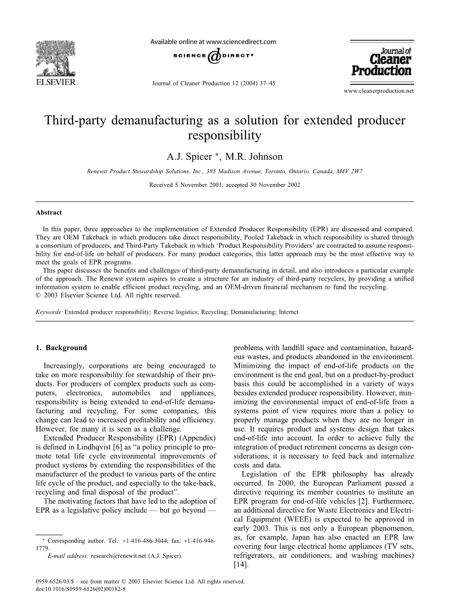 本文详细论述了第三方回收的有利优势和面临的挑战,同时也介绍了第三方拆卸的特殊案例。Renewit系统期望通过提供一个统一的信息系统,这个系统可以促进产品的有效回收以及提供由OEM驱动的金融机制,这个机制促进了资金的回收,从而创建一个第三方回收商的产业结构。Renewit系统版权由2003艾斯维尔科学有限公司所有。