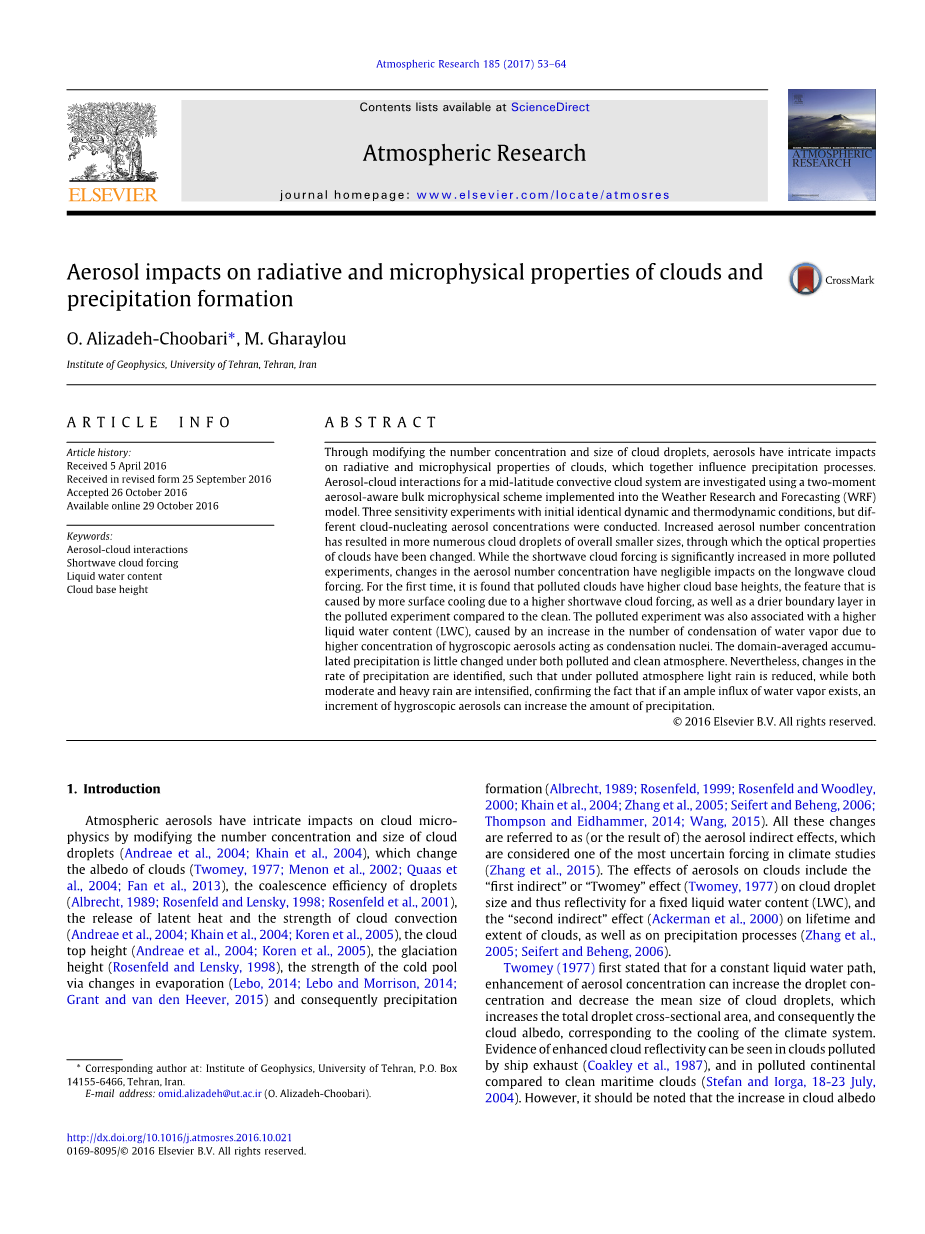 大气气溶胶通过改变云滴的数量浓度和大小对云微物理产生了复杂的影响 (Andreae et al.,2004;Khain et al.,2004),改变了云的反照率(Twomey,1977; Menon et al.,2002;Quaas et al.,2004;Fan et al.,2013),液滴的凝结效率(Albrecht,1989;Rosenfeld and Lensky,1998;Rosenfeld et al.,2001),潜热的释放和云对流的强度(Andreae et al.,2004; Khain et al.,2004; Koren et al., 2005),云顶高度(Andreae et al.,2004;Koren et al.,2005),冰川高度(Rosenfeld and Lensky,1998),冷池强度(Lebo,2014;Lebo and Morrison,2014;Grant and van den Heever,2015)以及降水的形成过程 (Albrecht,1989;Rosenfeld,1999;Rosenfeld and Woodley,2000;Khain et al.,2004;Zhang et al.,2005;Seifert and Beheng,2006;Thompson and Eidhammer,2014;Wang,2015)。所有这些变化被称为气溶胶的间接效应(或结果),这种效应被认为是气候研究中最不确定的强迫之一(Zhang et al.,2015)。气溶胶对云层的影响包括对云滴尺寸的“第一直接”影响或者“Twomey”影响(Twomey,1977),而由此产生的液体水含量(LWC)的变化,和对云的生命周期和降水过程的影响被称为“第二间接”效应(Ackerman et al.,2000)(Zhang et al.,2005; Seifert and Beheng,2006)。
