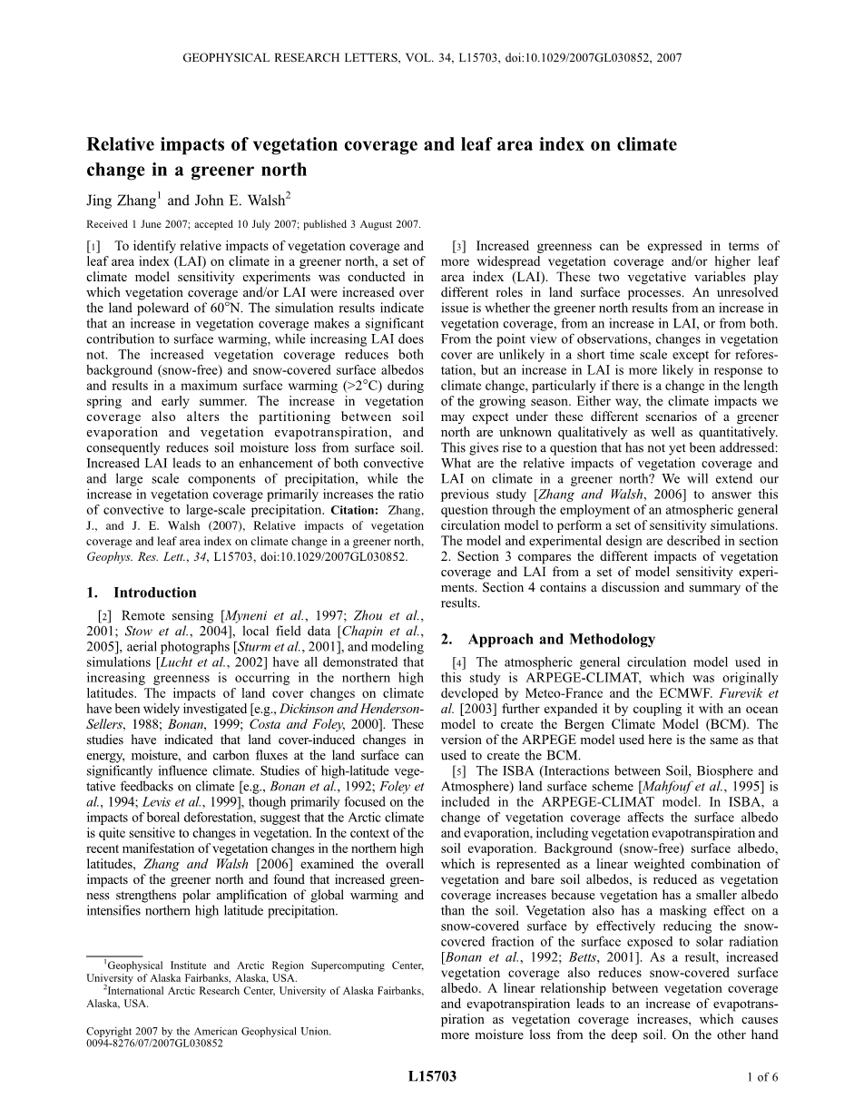 为了确定植被覆盖度和叶面积指数(LAI)对气候变化背景下北极变绿的相对影响,针对植被覆盖和/或叶面积指数增长了的60°N以北的土地进行了一组气候模式敏感性实验。模拟结果表明,植被覆盖度的增长对地表变暖有着显著贡献,而叶面积指数的增长没有。植被覆盖度的增长同时降低了地表无雪和冰雪覆盖情况下的地表反照率,并导致春季和初夏的的最大地表增温(gt;2°C)。植被覆盖度的增长也影响了土壤蒸发量与植被蒸腾量之间的分配,从而减少了地表土壤的土壤水分流失。叶面积指数的增长导致对流性降水和大尺度降水的同时增强,而植被覆盖度的增长主要是增加对流性降水和大尺度降水的比值。