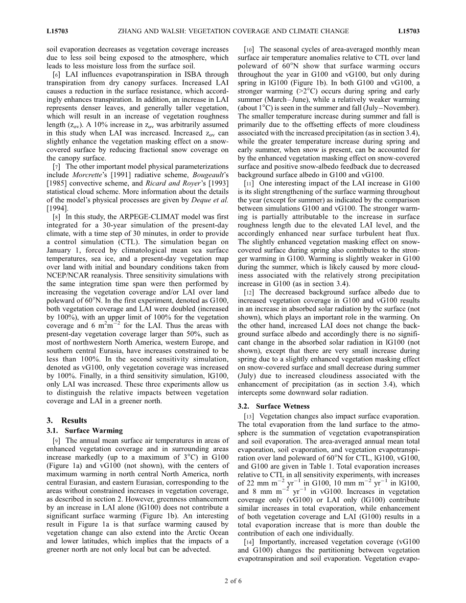 实验G100中叶面积指数的增加有一个有趣的影响,通过实验G100和VG100之间的对比可以表明,叶面积指数的增长可以轻微的增强全年(除了夏天)的地表升温。较强的气候变暖部分归因于由叶面积指数水平的升高和相应增强的近地表湍流热通量导致的地表粗糙度的增加。实验G100中,轻微增强的植被对于白雪覆盖表面的掩蔽效应也有助于春季的气候变暖。实验G100中,夏季的气候变暖较为微弱可能是由于夏季有更多与较强降水增加有关的云量(见3.4节)。