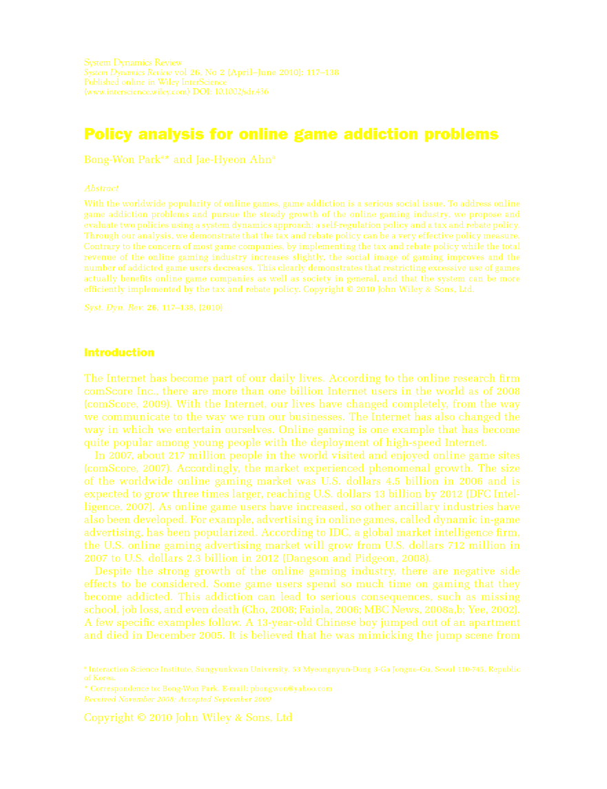 2007年,全球约有2.17亿人访问并享受在线游戏网站(comScore, 2007)。因此,市场经历了一些政府采取措施解决游戏成瘾问题。在对3000多人进行了4年的分析之后,中国政府首次将网瘾归为一种临床疾病。随后,2005年北京军区中心医院开设了治疗青少年成瘾患者的治疗门诊,据估计,青少年网络游戏用户占了10% (Ang, 2005;麦,2008)。中国还实施了一个疲劳系统。它的工作方式是不给游戏玩家提供完整的游戏点数,游戏玩家连续玩3个小时以上(Dickie, 2005;BBC新闻,2007)。泰国政府要求网络游戏产业关闭政策。因此,人们不能在晚上10点到6点之间玩网络游戏(ZDNet英国)。,2003)。在美国和欧洲,许多诊所都开设了帮助有网瘾问题的病人(Freeman, 2008)。