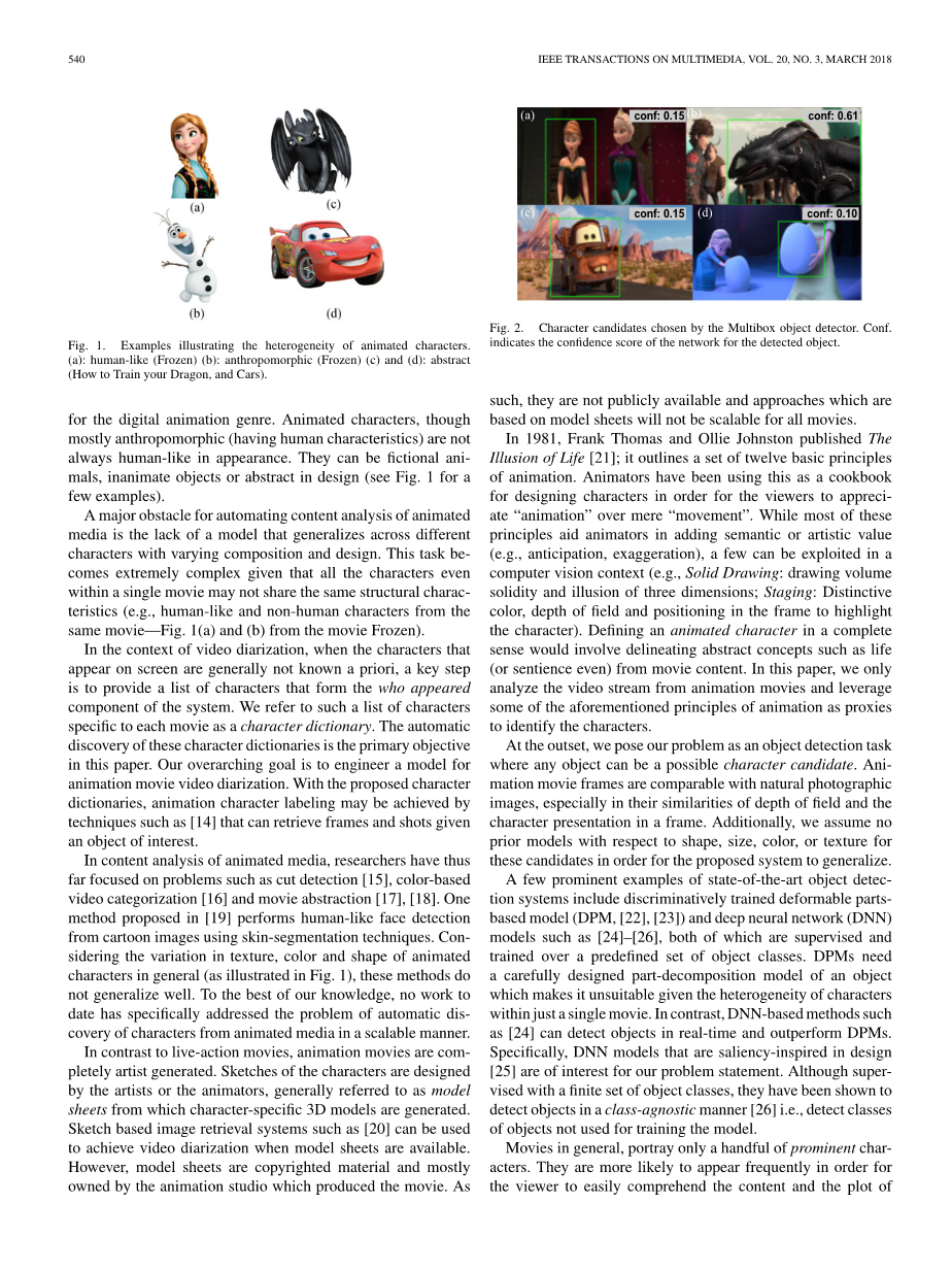 动画师一直在使用这个作为设计充电器的食谱 演员是为了让观众在仅仅是“动作”上加上“动画”。虽然这些原则大多有助于动画工作者增加语义或艺术价值(例如,预期、夸张), 有几个可以在计算机视觉环境中被利用(例如,实心绘图:三维的画卷、立体和错觉;分期:独特的颜色、景深和在fr中的位置)。 以突出字符)。定义一个完整意义上的动画角色将涉及到从电影内容中勾勒出抽象的概念,比如生活(甚至是感觉)。在本文中,我们 仅从动画电影中分析视频流,并利用上述动画的一些原则作为代理来识别角色。