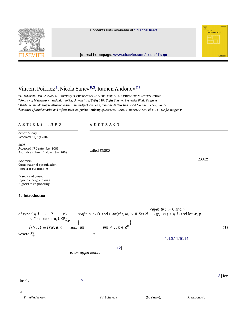 在本文中,我们引入一个新的上界,并确定UKP家组。我们也设计一个新算法,该算法结合了动态规划解决UKP的方法。这是第一次,这种方法用于UKP。大量的计算实验证明可以有效地把分支界限算法嵌入到动态规划框架里。这些结果也揭示了UKP实例十分困难。