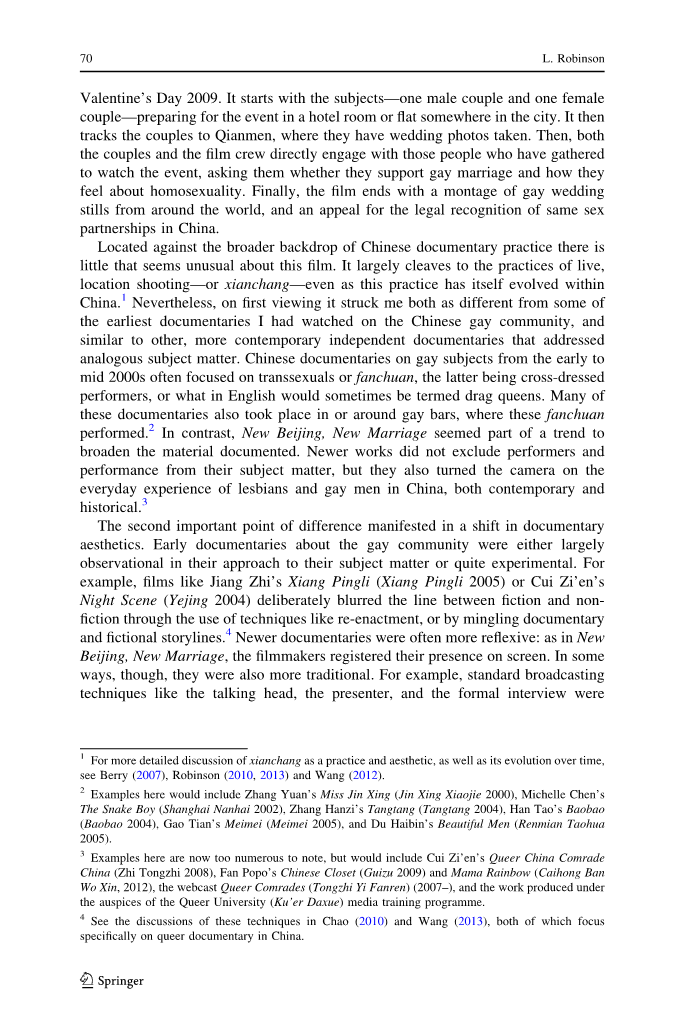 我的这篇文章的出发点是由范波波和戴维成的纪录片“新北京新婚”(新前门大街2009)。这部电影记录了2009年情人节在北京前门大街举行的一场同性恋婚礼的表演。它开始于一对男性夫妇和一对女性夫妇,准备在城市某个旅馆房间或公寓中举办活动。然后跟踪夫妻前往前门,拍摄结婚照。然后,夫妻和摄制组直接与那些聚集在一起观看事件的人进行接触,询问他们是否支持同性恋婚姻以及他们对同性恋的感受。最后,这部电影以来自世界各地的同性恋婚礼剧照的剪辑结束,并呼吁中国同性恋合作伙伴的法律承认。