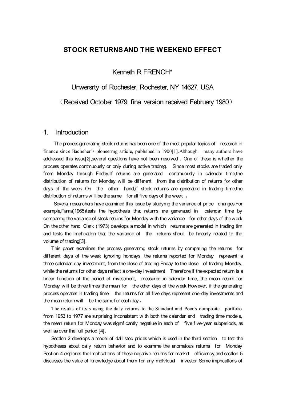 这篇文章通过比较一周中每天的收益来检验产生股票收益的过程。不考虑节假日,从上周周五结束交易到周一结束交易,周一的收益报告代表了三个工作日的投资,而这周内其他四天的收益分别反映了一天的投资。因此,如果用日历时间来计算,预期收益在一段投资期内呈现线性相关,那么周一的平均收益就是本周其他四天平均收益的三倍。然而,如果这个产生过程是在交易时间假设下进行的, 五天的收益都各自反映一天的投资,且每天的平均收益是相同的。