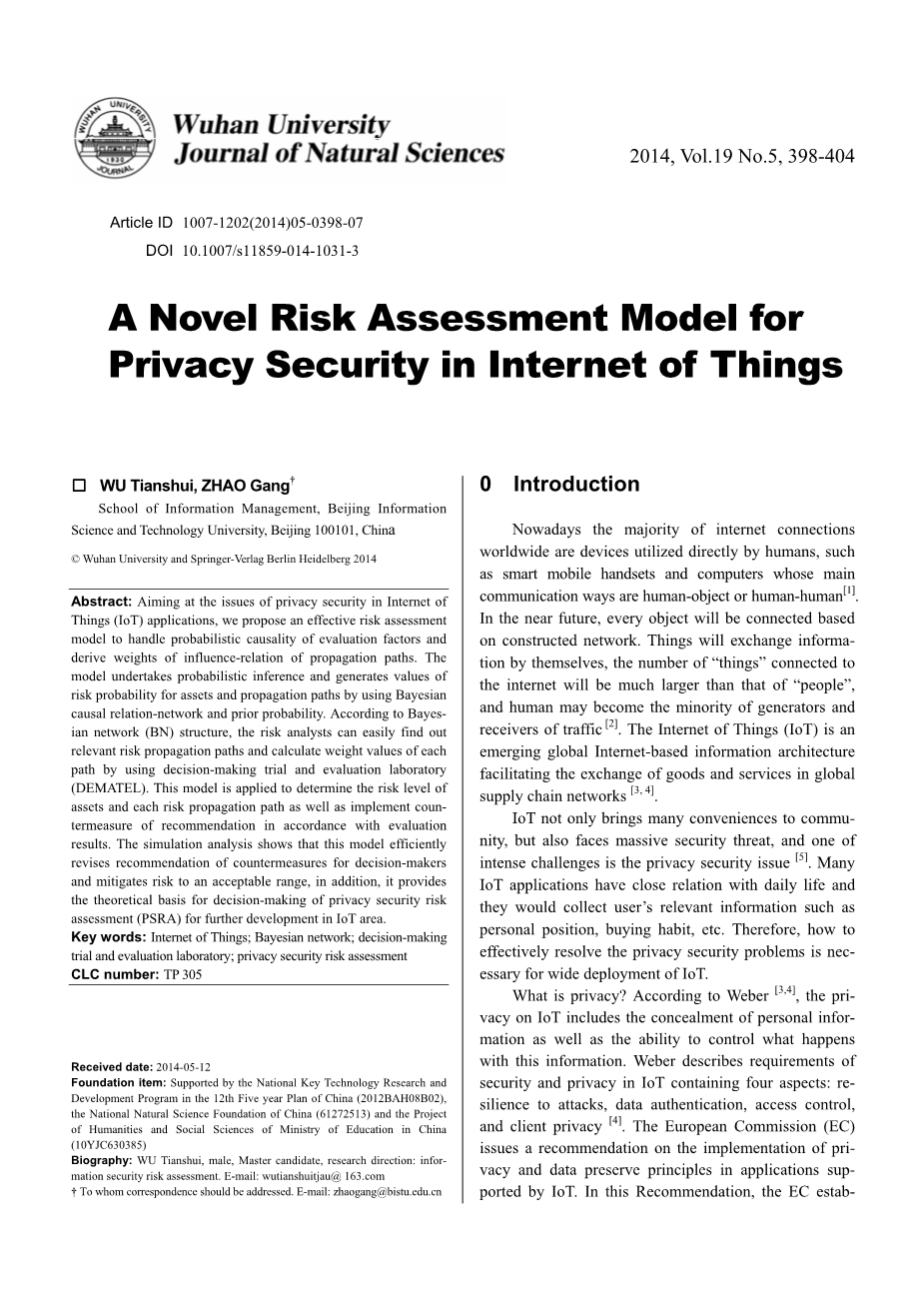 关键词:物联网;贝叶斯网络;决策实验评估实验室;隐私安全风险评估