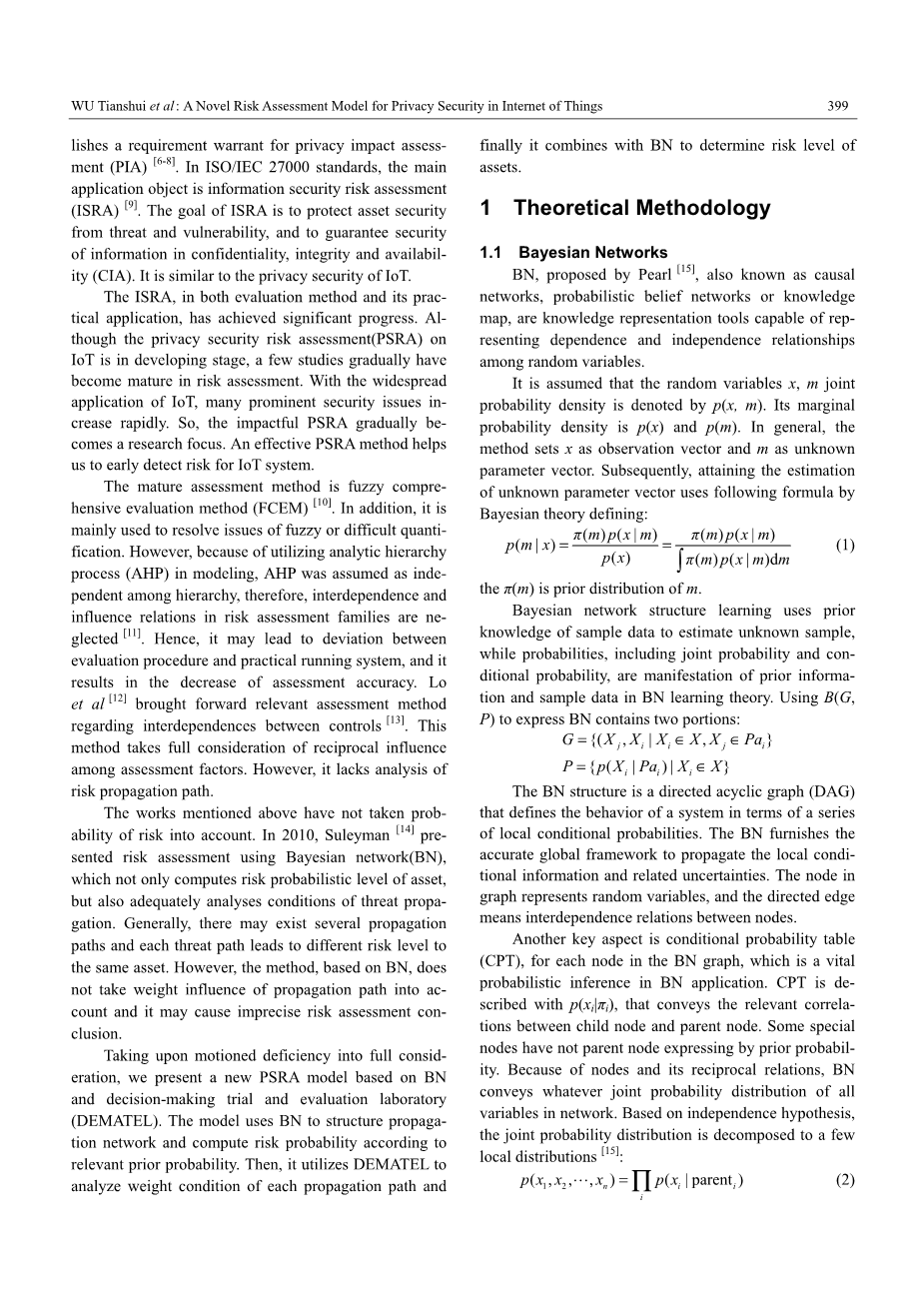上面提到的研究都没有考虑到风险发生的可能性。2010年,Suleyman提出一种基于贝叶斯网络(BN)的风险评估,它不仅能够计算资产风险的概率水平,而且还能充分分析威胁传播的条件。一般情况下,可能存在多个传播路径,并且对于同一资产,不同的威胁路径会导致不同的风险水平。然而,基于贝叶斯网络的评价方法,并没有考虑传播路径的权重的影响,因此,它可能会得出不精确的风险评估结论。