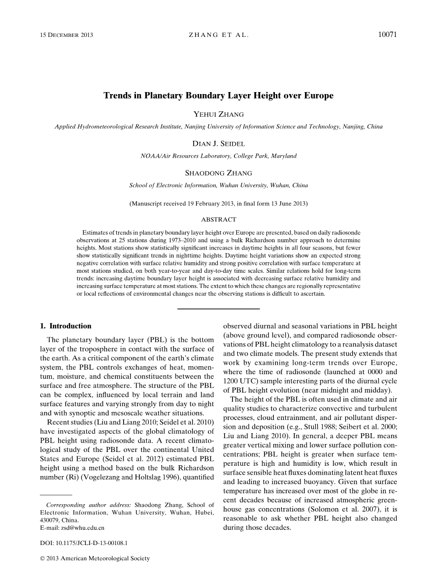 基于1973年至2010年的25个站点的逐日无线电观测数据,使用总体理查森数法确定高度,估算了欧洲上空的行星边界层高度的变化趋势。大多数的站点在四个季节里都显示出日间高度存在统计显著增长,但是夜间高度显示出统计显著趋势却很少。多数研究站点显示,日间高度变化在年时间尺度与日尺度上与地面相对湿度呈现较强反相关而与地面气温呈现强正相关。类似的关系也适用于长期趋势:在多数站点,白天逐渐增长的边界层高度与逐渐减少的地面相对湿度和逐渐增加地面气温相联系。这些变化具有区域代表性或是对观测站点附近环境变化的一种反映,能否适应其他区域是很难去确定的。