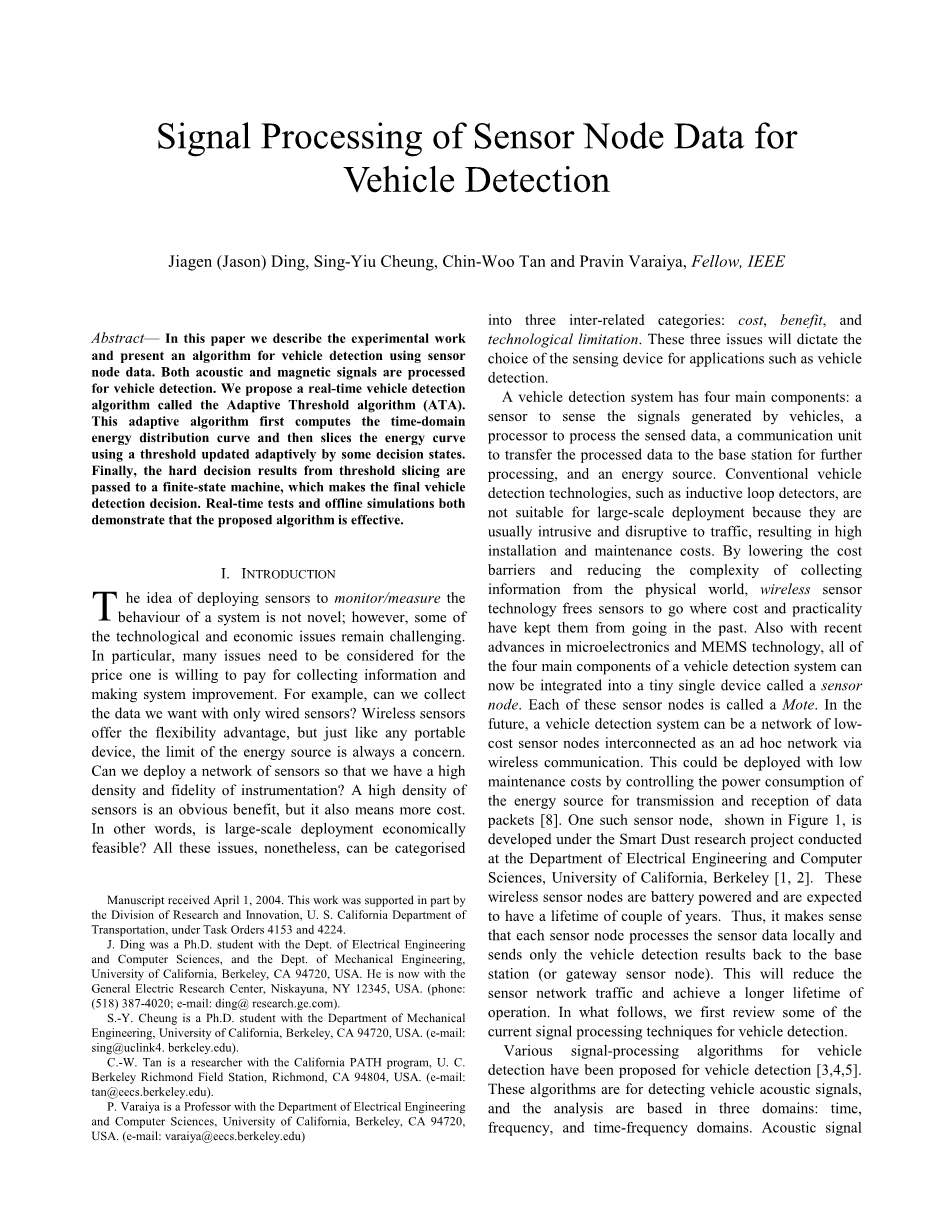 摘要:在本文中,我们描述了一项用于车辆检测的实验工作,并提出了一种使用传感器节点数据进行车辆检测的算法。我们将声音信号和电磁信号用于这种信号处理。于是我们提出一种自适应阈值(ATA)的实时车辆检测算法。 该自适应算法首先计算时域能量分布曲线,然后利用一些决定性的自适应更新的阈值对能量曲线进行分割。最后,将阈值分割的决策结果传递给识别系统进行最终车辆检测判定。实时测试和离线仿真都表明我们所提出的算法是有效的。