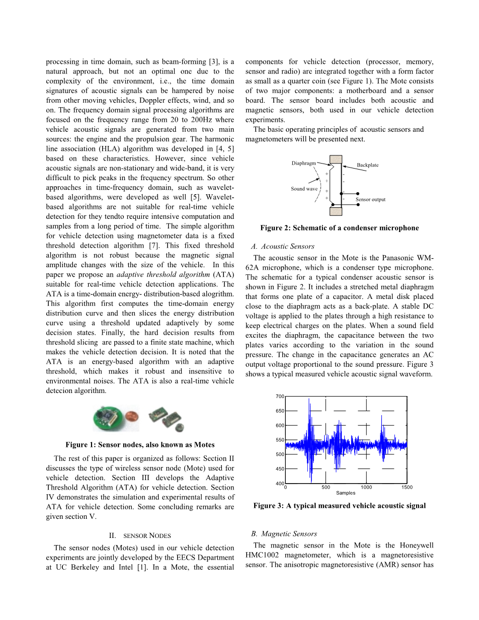 本文的其余部分内容如下:第二部分讨论了用于车辆检测的无线传感器节点(Mote)的类型。 第三部分开发了用于车辆检测的自适应阈值算法(ATA)。 第四节演示了ATA车辆检测的仿真和实验结果。第五节是一些结语。