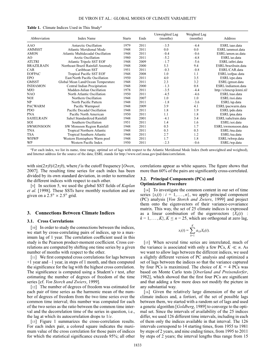 大气、水圈和冰雪圈形成了一个完全耦合的气候系统。该系统展示了许多大规模的现象,如厄尔尼诺—南方涛动(ENSO)、亚洲季风、北大西洋涛动(NAO)和热带季节内振荡(MJO)。虽然这些变化的模式并不完全是周期性的,但它们在性质上是振荡的,并且它们的状态使用气候指数来监测。每一个标量指数都是几个气候变量的组合。在这里,我们使用了一套综合的25组气候指数,时间间隔在1948年到2011年之间,并估计了这些指标之间的一个最优滞后集,以最大化它们之间的相关性。我们发现,从这个集合中得出的大多数指数对在年际时间尺度上都有显著的相关性。它还表明,平均而言,每个指标中约三分之二的可变性可以用全部滞后指标集的四个主要基本成分来描述。我们的指数集的主要正交模式显示出几个年际频率,并分别分析与北大西洋和北太平洋相关的变率。这些模式又与海面温度的大范围变化相关联。