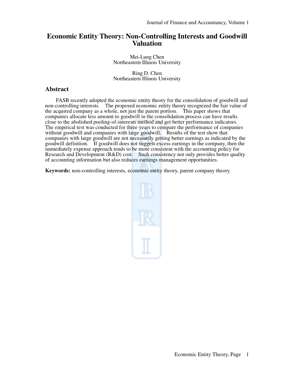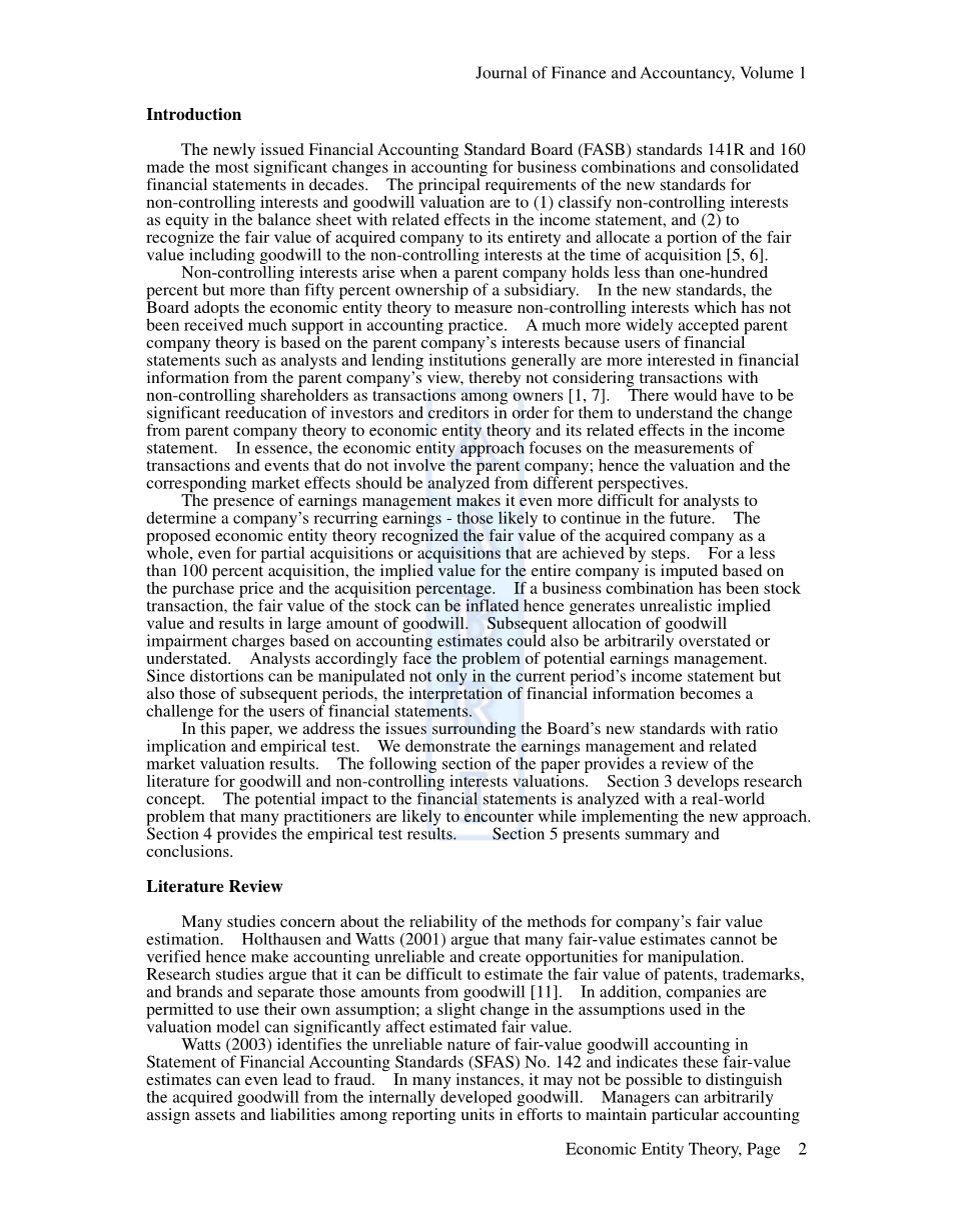 摘要FASB最近采用了经济实体理论来计量合并商誉和非控制性权益。提出经济实体理论认识被收购公司的公允价值作为一个整体,而不仅仅是属于母公司的部分。它的公告表明,企业在整合过程中分配较少的金额商誉可以加速权益结合法的废除并获得更好的会计信息。进行了三年的实验比较了没有商誉的公司和有较大商誉的公司的表现。结果表明拥有较大商誉的企业并没有相符合商誉的定义那样必然获得较大的利润。如果商誉并不代表获取利润的能力,那么直接费用会比开发费用更加适用于会计政策。这种一致性不仅提供的会计信息质量越好,但也降低了盈余管理的机会。