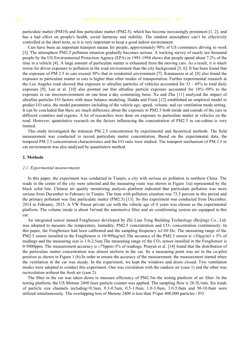 本文在天津这个中国北方空气污染严重的城市进行了实验。选择城市中心的道路,测量路线如图1(a)所示,用黑色实线表示。 中国空气质量监测分析平台显示,天津12月至2月颗粒污染较为严重。在此期间,污染情况的时间为73.5%,主要污染物为细颗粒物(PM2.5)[13]。这个实验是从2014年12月到2015年2月进行的。选择一辆车龄为4年的大众帕萨特私家车作为实验平台。 车内容积约3msup3;,车内装有汽车滤清器和空调系统。