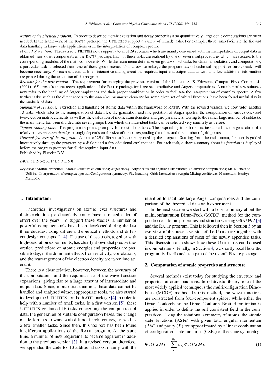 MCDF方法的实施经过了很多年,其中产生了很多新技术,包括强大的计算机工具,例如,著名的掌握代码[3]。大部分可用的MCDF代码不过只提供近似的能量并为选定数量的原子波函数绑定状态。其他数据的高效计算有关自由原子的激发和衰变动力学RATIP包[4]。这个程序适用于原子结构的波函数扩展代码包括GRASP92计算各种原子属性(放松)跃迁概率的计算和寿命,symmetry-adapted函数的表示形式行列式计算,生成连续轨道钻的计算属性和光电离横断面图。最近,RATIP特别有用在研究钻开壳层原子衰变(67)和改善的可用数据基地爱因斯坦系数,振荡器的优势,并为各种分支比用带电离子。此外,一个新的组件在RATIP光化电离的研究目前正在工作环境和未来将发布。