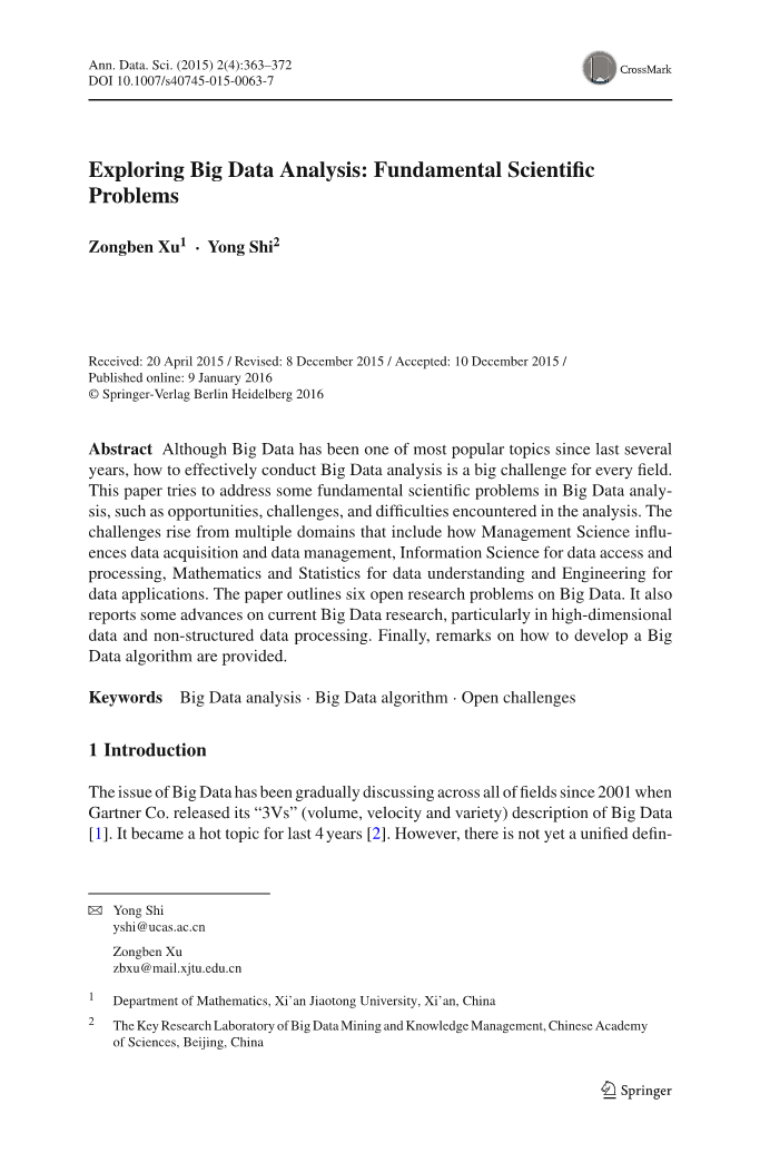 摘要:尽管大数据已经是近几年最流行的话题之一,可是如何有效地进行大数据分析任然是各个领域面对的巨大的挑战。本文试图解决一些大数据分析中遇到的基本问题,比如机会,挑战,以及对遇到的困难进行分析。大数据分析面对的挑战来自多个领域,包括管理科学如何影响数据采集,数据管理、数据访问,信息科学处理,工程数学对于数据的理解分析。本文概述了六个大数据上开放研究的问题。它还报告对当前大数据研究进展,特别是在高维数据和非结构化数据的处理。最后,评价如何开发一个大数据算法。