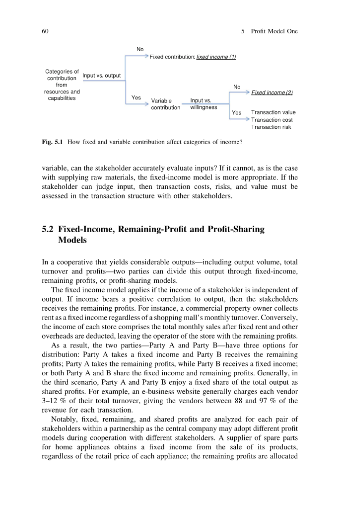 在一个产出相当可观产出的合作中,包括产出量,总营业额和利润,两方可以通过固定收入,剩余利润或利润共享模型来分配这一产出。 固定收入模式适用于利益相关者的收入与产出无关的情况。 如果收入与产出正相关,那么利益相关者会收到剩余的利润。 例如,一个商业物业的业主将收租作为他的固定收入,但这是无法满足小额购物的每月营业额。相反,每一个商店的收入额是指月营业总额扣除房租和其他支出,剩下的利润由商店运营商获得。