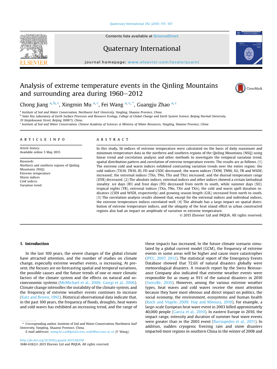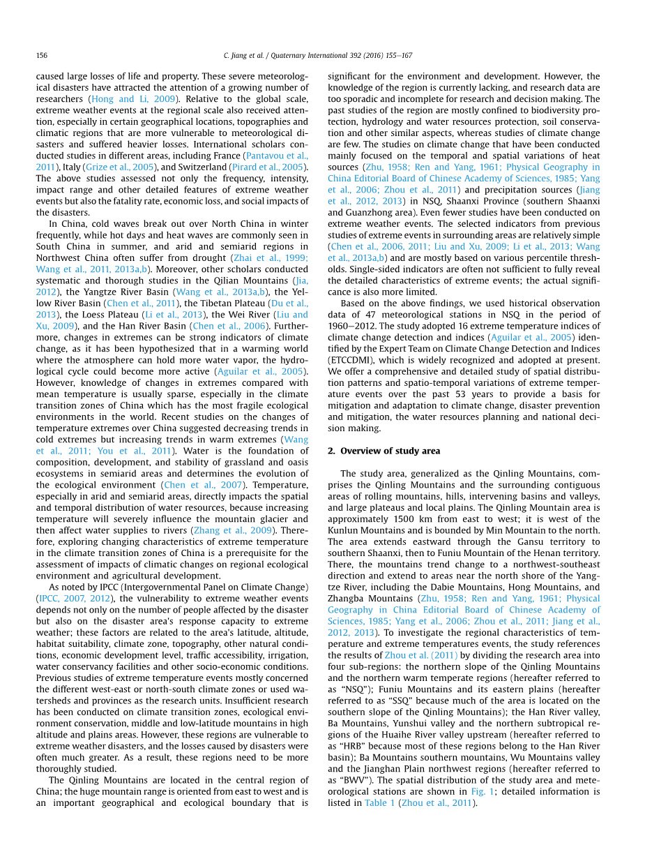 IPCC指出,易受极端天气事件影响不仅取决于受灾的人数也取决于灾区的反应能力,因素有地区的纬度、海拔、生境适宜性、气候区、地形、经济发展水平、交通可达性、灌溉、水利设施等社会经济条件。之前极端温度事件的研究主要关注不同的气候区或用省市为研究单位。中、低纬度高海拔山区和平原地区,是容易受到极端天气灾害,灾害造成的损失往往更大。因此,这些地区需要更彻底的研究。秦岭山脉位于中国的中部地区;巨大的山脉是东西走向,是一个重要的地理和生态边界,对环境与发展具有重要意义。然而,由于该地区目前的知识缺乏,研究数据过于分散和不完整。过去的研究大多局限于该地区生物多样性,水文和水资源保护、土壤,而气候变化的研究很少。研究在气候变化问题上,主要集中在时间和空间变化。
