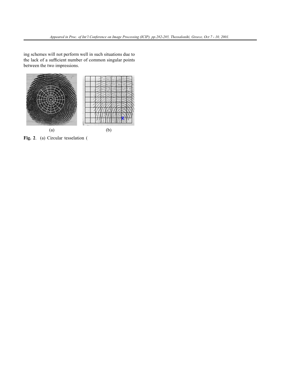 我们描述了一个混合的方式,以指纹匹配,结合具有的伽柏滤波器(纹理为主)的代表进行匹配指纹的细节基础的表示。基于纹理的表示指纹是在[5]中所描述的方法的修饰。该算法首先对两个指纹我们ING从两个图像中提取的细节点,和然后使用纹理信息来执行详细匹配。其结果是,比细节点的详细信息是被用于匹配的指纹。得到的匹配分数与使用基于特征匹配算法获得相结合。验证的结果表明,所提出的混合方法是更适合于使用紧凑的固态传感器获得的图像。