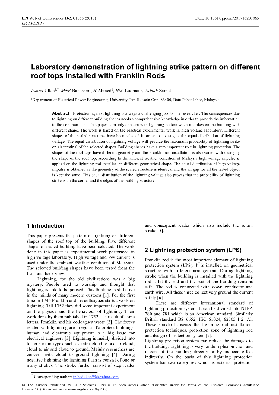 本论文介绍了闪电击中五种不同形状的建筑物屋顶时不同的发生模式,论文中所有实验均在高压实验室内完成。根据马来西亚周边的天气状况,选用了高电压与低电流的冲击实验。从被选用建筑外形的前后两面进行测试实验。
