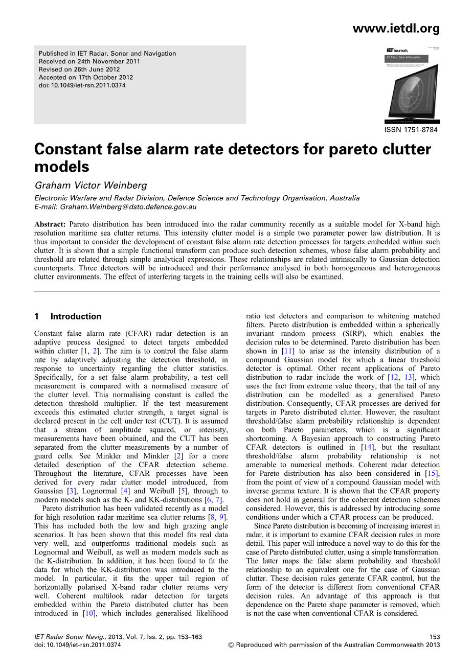 帕累托分布最近已被证实为高分辨率雷达海杂波回波模型。这包括低入射余角和高入射余角的情况。已经表明,该模型非常适合实际数据,优于传统的模型,如对数正态和Weibull,以及现代模型,如K分布。此外,已经发现适合于将KK分布引入到模型中的数据。它适合于水平极化X波段雷达杂波返回的上尾部区域。在帕累托分布杂波中嵌入了目标的相干多视雷达检测,其中包括广义似然比测试检测器和白化匹配滤波器的比较。帕累托分布嵌入球不变随机过程(SIRP),这使得决策规则得以确定。帕累托分布显示为线性阈值检测器最优的复合高斯模型的强度分布。帕累托分布在雷达上的其他最近应用包括[12, 13 ]的工作,它使用极值理论的事实,任何分布的尾部都可以被建模为广义帕累托分布。因此,针对帕累托分布杂波中的目标,导出了CFAR过程。然而,所产生的阈值/虚警概率关系依赖于两个帕累托参数,这是一个显著的缺点。在帕累托〔14〕中概述了构造贝叶斯恒虚警检测器的贝叶斯方法,但是所得到的门限/虚警概率关系不适用于数值方法。相干雷达探测对于帕累托分布,也曾在[15 ]中考虑,从具有逆伽马纹理的复合高斯模型的角度考虑。结果表明,对于相干检测方案,CFAR性质一般不成立。然而,这是通过引入一些条件来解决的,在该条件下可以产生CFAR过程。
