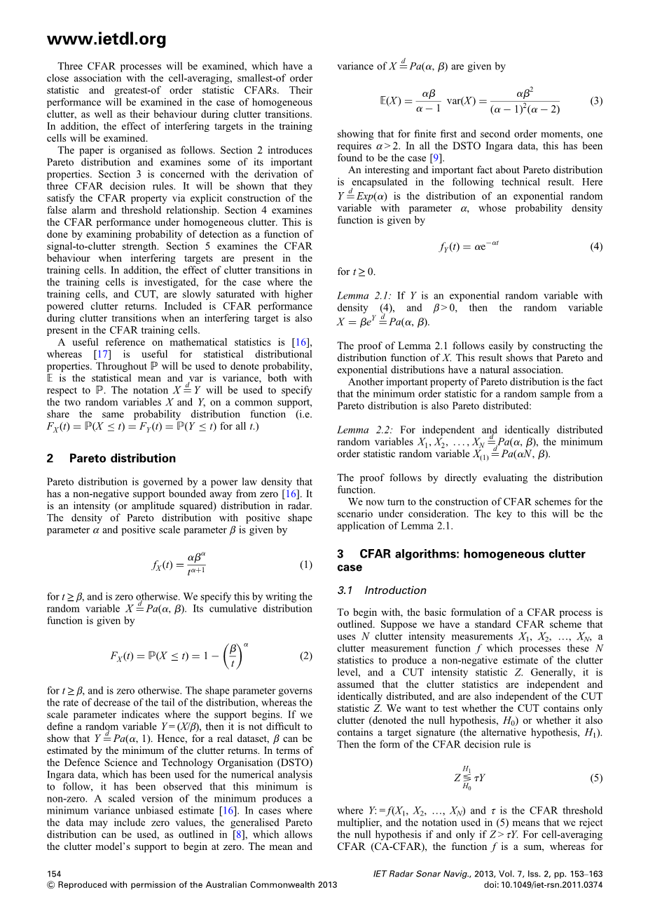 本文的组织如下,第2节介绍了帕累托分布,并考察了它的一些重要性质。第3节涉及三个CFAR决策规则的推导。结果表明,它们通过显式构造虚警和门限关系来满足CFAR属性。第4节研究了均匀杂波下的CFAR性能。这是通过检测作为信号与杂波强度函数的检测概率来完成的。第5节检查当干扰目标存在于训练单元中时的CFAR行为。此外,研究了训练单元中杂波转换的影响,对于训练单元和CUT被高功率杂波返回缓慢饱和的情况。 包括在CFAR训练单元中也存在干扰目标时,杂波转换期间的CFAR性能。