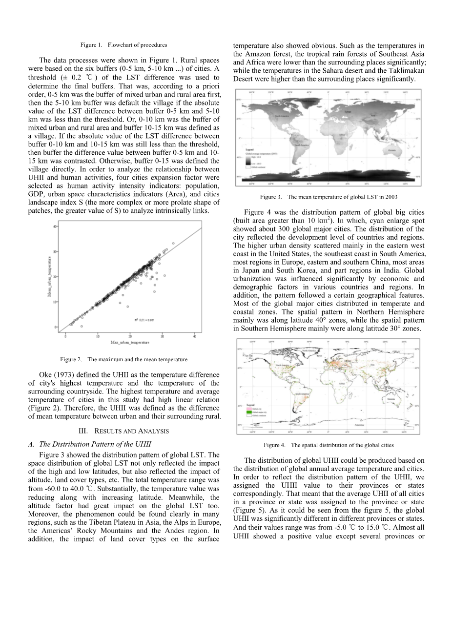 OKE(1973)定义了UHII为城市的最高温度和温度周围的乡村的温差。城市的最高温度值和平均温度值在这项研究中有很高的线性关系 (图2)。因此,UHII被定义为不同城市及其周边农村之间的平均温度差。