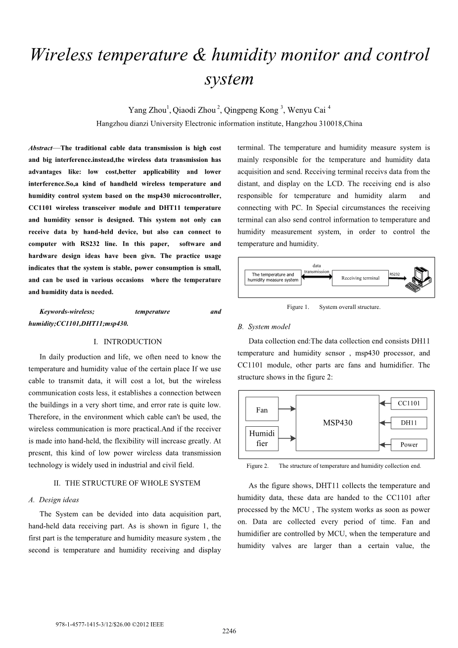 摘要 - 传统的有线数据传输成本高,干扰大,而无线数据传输具有成本低,适用性好,干扰小等优点。因此,本文提出了一种基于 msp430 单片机的手持式无线温湿度控制系统,CC1101 无线收发模块和 DHT11 温湿度传感器。 该系统不仅可以通过手持设备接收数据,还可以通过 RS232 线与计算机连接。 在本文中,软件和硬件设计思想已经被提出。 实践表明,系统稳定,功耗小,可用于需要温湿度数据的各种场合。