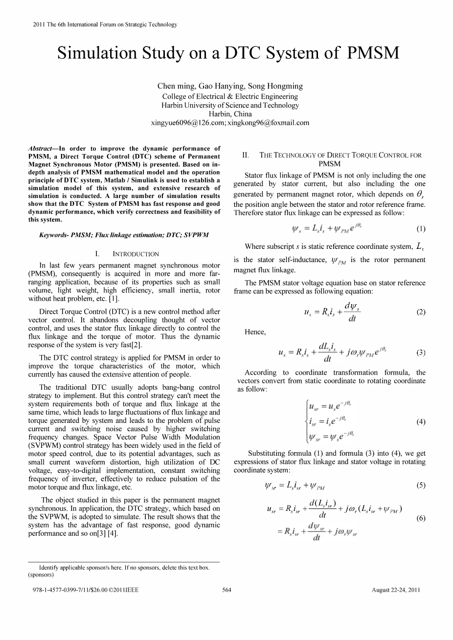 [5] D. Sun, F. Weizhong, H. Yikang, Study on the Direct Torque Control of Permanent Magnet Synchronous Mot