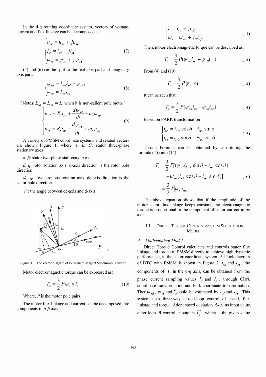 本文研究的对象是永磁同步电机。在应用中, 基于空间矢量脉宽调制的DTC策略将会用来仿真。结果表明,该系统具有响应速度快的优势,良好的动态性能等[3][4]