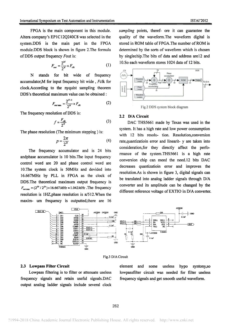 FPGA是该模块的主要组件。 在系统中选择了Altera公司的EP1Cl2Q240C8 .DDS是FPGA模块的主要部分.DDS模块如图2所示。公式的DDS输出频率Fout为: