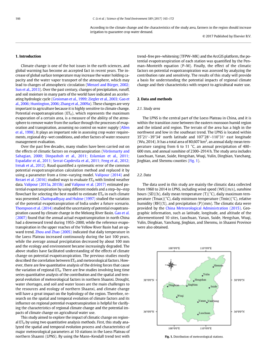 在过去几十年中,已经对气候因素对蒸散量的影响进行了许多研究(Vouml;rouml;smarty 和 Sahagian,2000; Dinpashoh et al。,2011; Eslamian et al。,2011; Espadafor et al。,2011; Serrat -Capdevila et al。,2011; Feng et al。,2012; Irmak et al。,2012 )。Ruud定量了公共潜在蒸散量计算方法的系统误差,并通过使用来自时变模型的参数来代替它。Valipour (2014)和Rezaei et al. (2016)研究了有限天气数据评估ET0的方法。Valipour (2015a, 2015b) 和Valipour et al. (2017)通过使用不同的模型估计潜在的蒸散量,并提供了逐步流程图,用于选择最佳模型来估计每个气候的ET0 。Chattopadhya y和Hulme(1997)研究了未来情景下印度潜在蒸散量的变化。Thompson et al.(2014)研究了湄公河流域气候变化引起的潜在蒸发量的不确定性。Gao et al. (2007)发现了在中国北方的年实际蒸散量在1955年至2000年呈下降趋势,而黄河上游参考蒸散量呈上升趋势。Zhou和zhao(2005)指出黄土高原日气温在过去100年间持续上升,而平均年降水量减少了大约100毫米,生态环境日益恶化。以上研究有助于了解气候变化对潜在蒸散量的影响。以前的研究主要描述了ET0和气象因素之间的相关性。然而,导致区域ET0变化的驱动力的定量分析很少。陕西省气象要素的贡献和时空演变的长时间序列定量分析研究较少。干旱,水资源短缺,水土流失是陕北资源与生态的主要挑战,气候变化将对该地区的水文学产生重大影响。因此,对气候因素及其对区域潜在蒸散量影响的空间和时间演变的研究有助于阐明区域气候变化的特征和气候变化对农业用水的潜在影响。水土流失是陕北资源和生态学的主要挑战,气候变化对该地区的水文学有重要的影响。因此,对气候因素及其对区域潜在蒸散量影响的空间和时间演变的研究有助于阐明区域气候变化的特征和气候变化对农业用水的潜在影响。水土流失是陕北资源和生态学的主要挑战,气候变化对该地区的水文学有重要的影响。因此,对气候因素及其对区域潜在蒸散量影响的空间和时间演变的研究有助于阐明区域气候变化的特征和气候变化对农业用水的潜在影响。