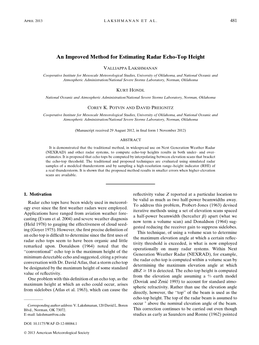 现已证明在下一代天气雷达(NEXRAD)和其他雷达系统中广泛应用于计算回波顶高的传统方法会导致或高或低的误差。 因此本文建议通过在包涵回波顶高阈值的仰角扫描之间进行插值来计算回波顶高。 我们使用了相关雷暴模型的模拟雷达数据样本分析来对传统技术和本文推荐的技术进行评估,并通过对真实雷暴的高分辨率的距离高度指标(RHI)进行采样。 结果表明,当高仰角扫描可用时,本文所提出的方法可以促使误差减小。