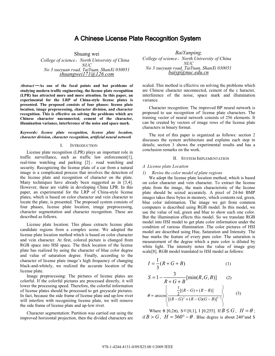 [7] Jianfeng Xu, Zhibin Chen, and Shaofa Li, 中国车牌识别色彩分析, RISSP. 2003, 1312-1216