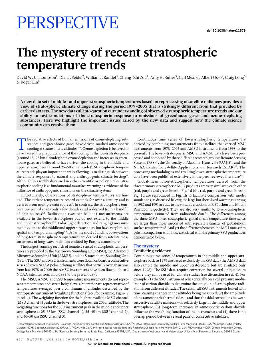 最近的平流层温度趋势之谜DavidW.J.Thompson1,DianJ.Seidel2,WilliamJ.Randel3,Cheng-ZhiZou4,AmyH.Butler5,CarlMears6,AlbertOsso7,CraigLong5 amp; Roger Lin5
