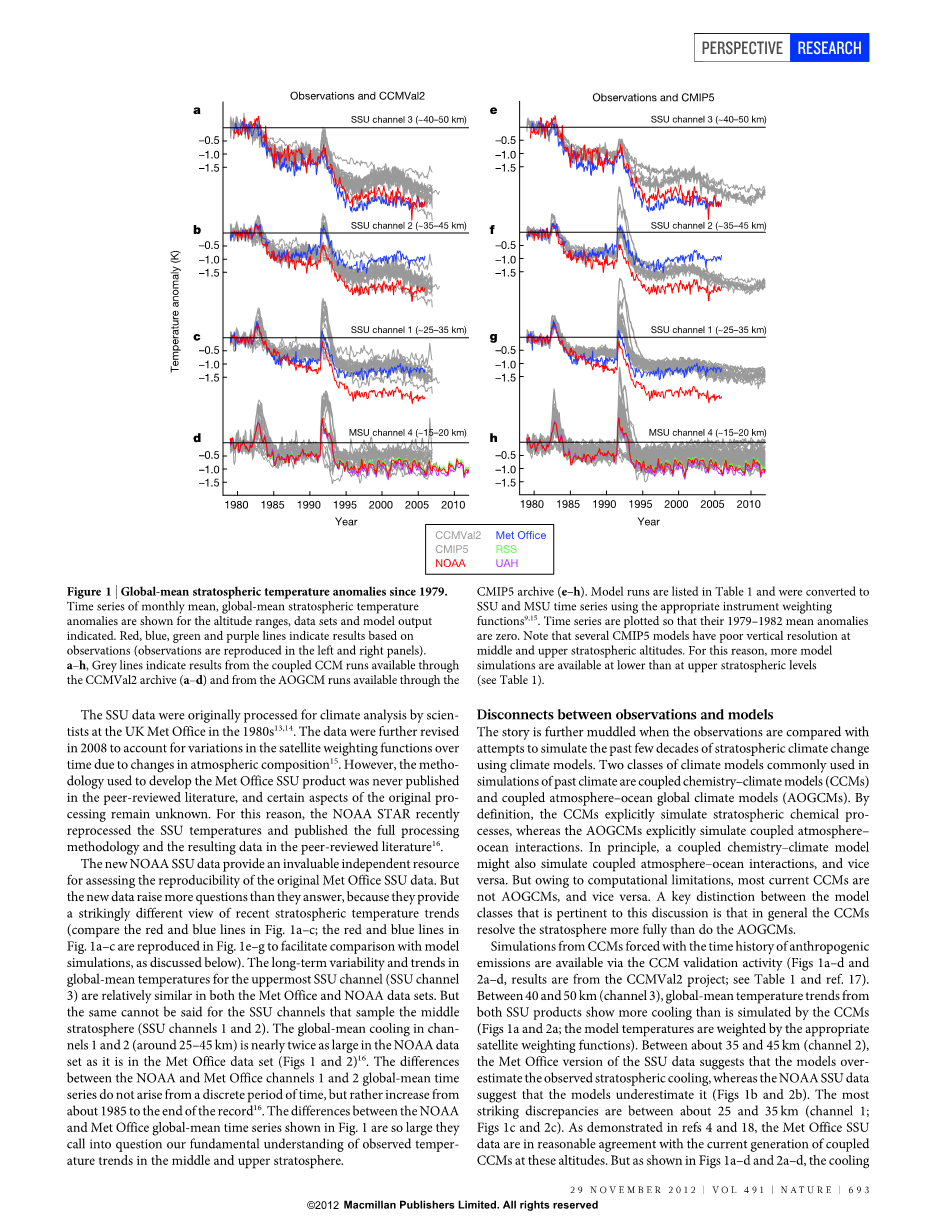 相比之下,全球平均同温层温度的趋势相对简单,以定量限制。 平流层质量循环对温度趋势的影响在全球意义上的温度是可以忽略的,因为上下运动的区域平均出来。 因此,全球平均同温层温度的趋势几乎完全由平流层组成变化的辐射效应驱动,主要是二氧化碳和臭氧浓度的变化,以及水蒸气,气溶胶和其他微量气体浓度的变化。 如果NOAA SSU数据是正确的,则CCMVal2和CMIP5模型都可能缺少平流层组成的关键变化。